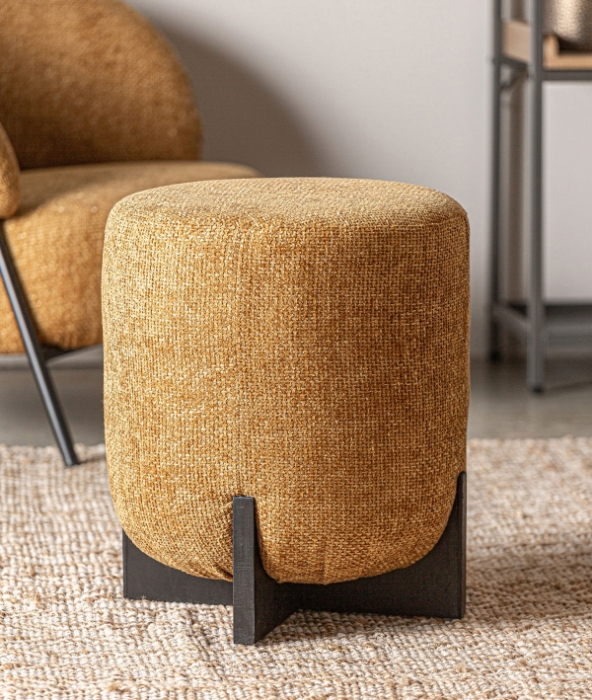 Acest taburet tapitat in stofa texturata ocru este o piesa contemporana cu volum compact, potrivita pentru completarea zonelor de relaxare sau a spatiilor de zi. Forma cilindrica si baza contrastanta din lemn negru creeaza un obiect functional cu prezenta vizuala clara, usor de integrat in diferite amenajari interioare.