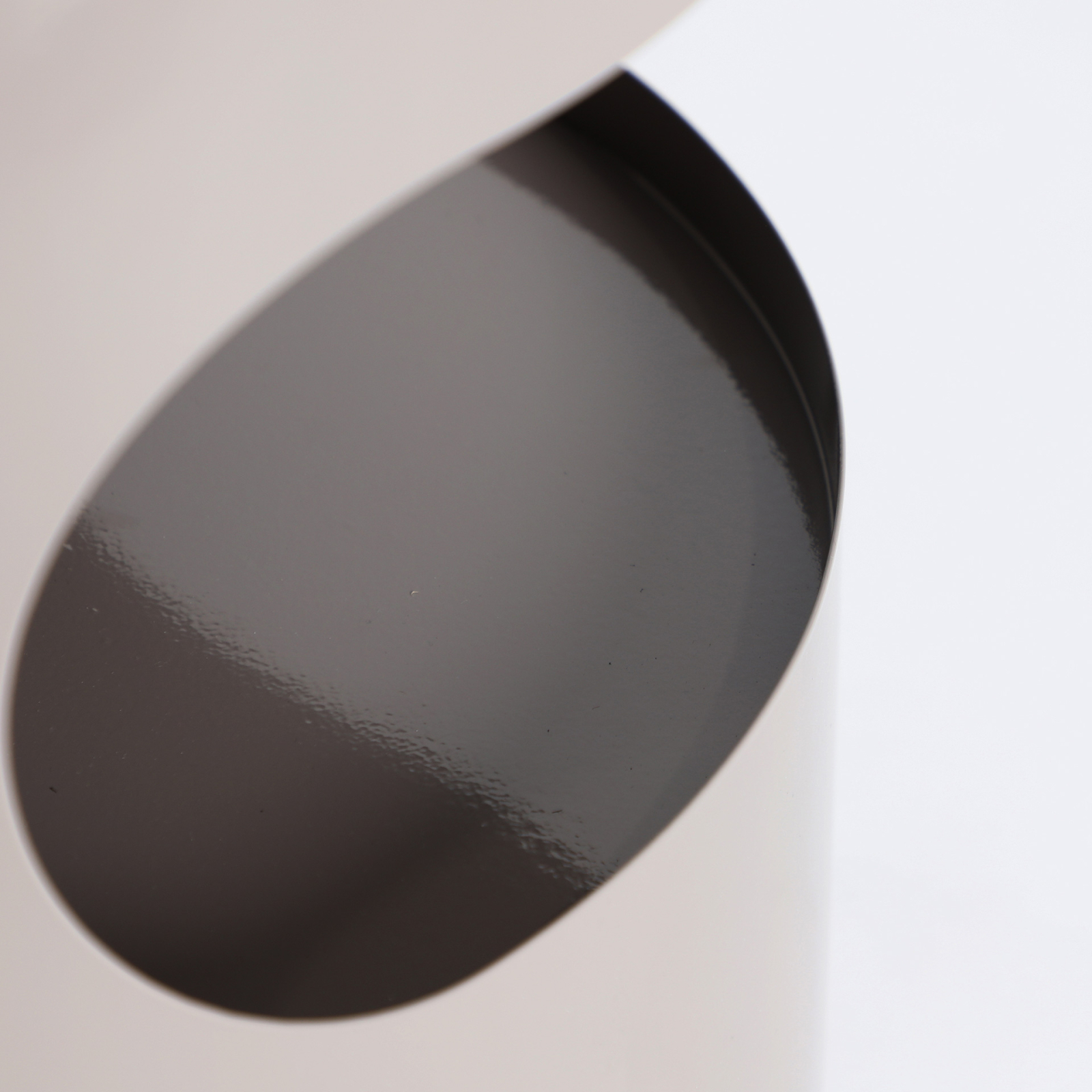 Noptiera din metal gri lucios cu blat din lemn de acacia este o piesă care ordonează vizual dormitorul. Contrastul dintre metal și lemn creează o senzație de echilibru calm. Forma cilindrică susține un ambient modern și bine structurat.