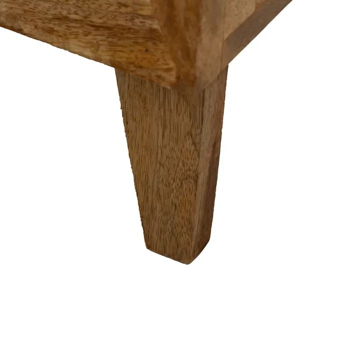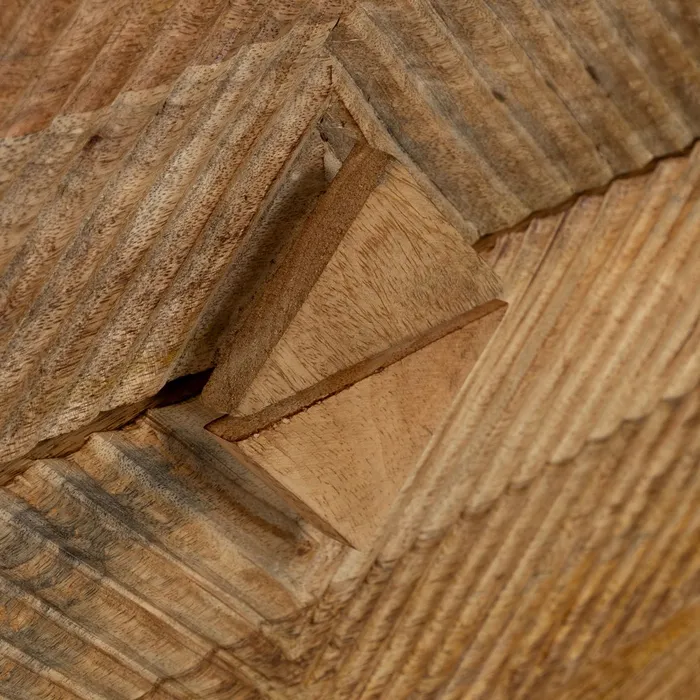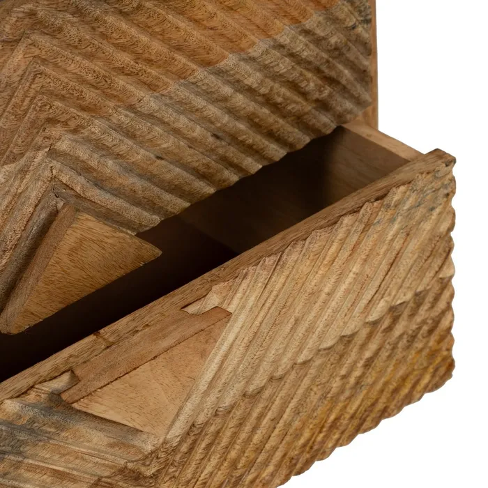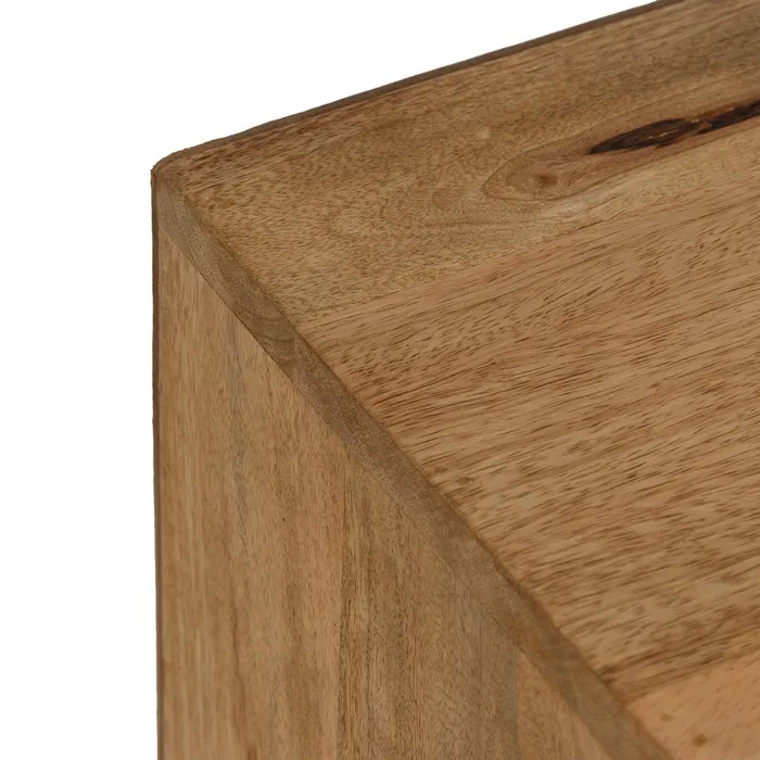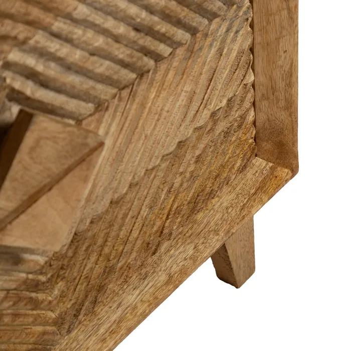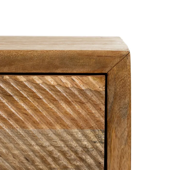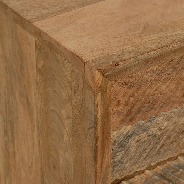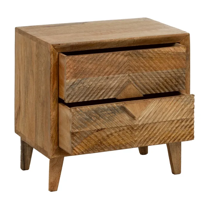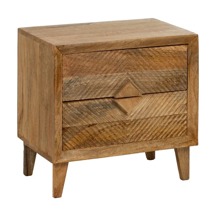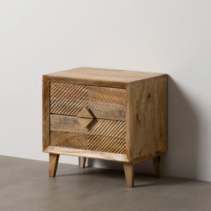 Noptieră din lemn natural de mango cu design compact și sertare decorative.