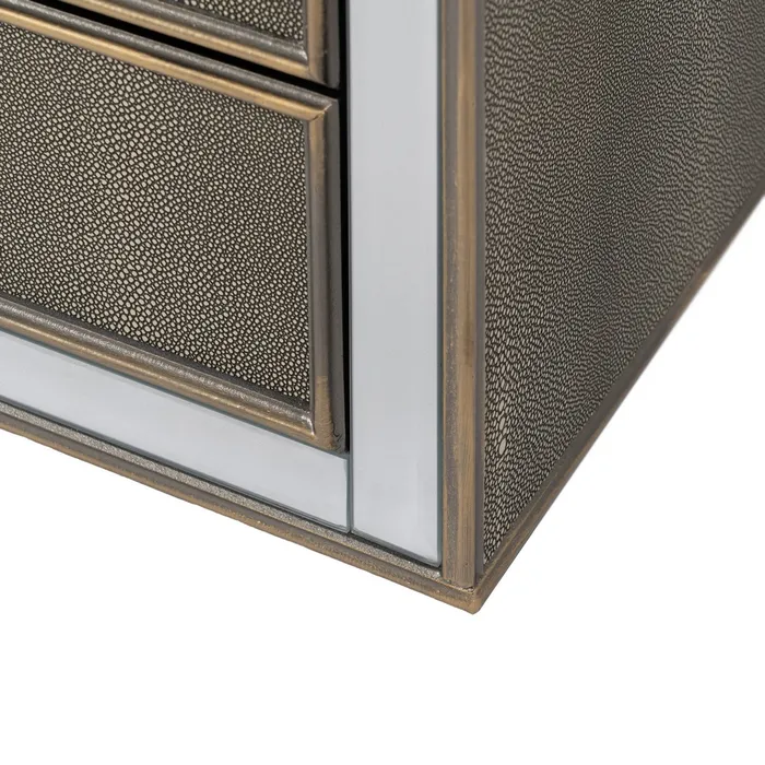 Această noptieră de lux Chloe, cu dimensiunile de 51 cm lățime, 41 cm adâncime și 51 cm înălțime, este o piesă elegantă și sofisticată, realizată din sticlă și material care imită pielea. Noptiera dispune de trei sertare spațioase, fiecare având dimensiunile de 42x13 cm, oferind un spațiu generos pentru depozitarea obiectelor personale. Finisajele aurii și textura sofisticată a sertarelor adaugă un aer glam, fiind ideală pentru interioare moderne și exclusiviste. Această noptieră este perfectă pentru a adăuga personalitate dormitorului tău. Comode și noptiere de lux doar la CreativDeco!