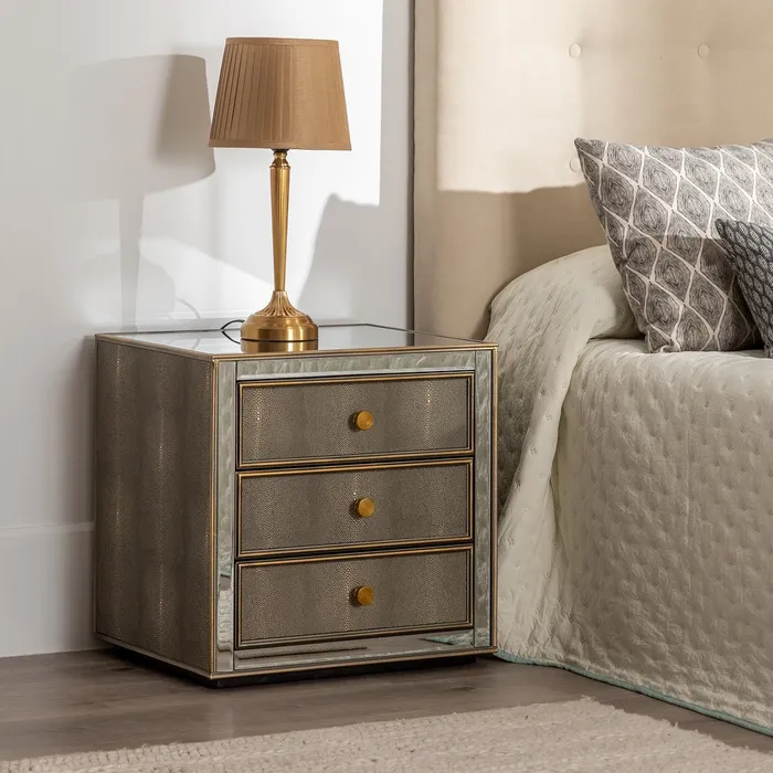 Noptieră de lux cu trei sertare spațioase, perfectă pentru organizarea obiectelor personale. Ideală pentru interioare moderne și exclusiviste. Mobilier de lux pentru dormitoare.