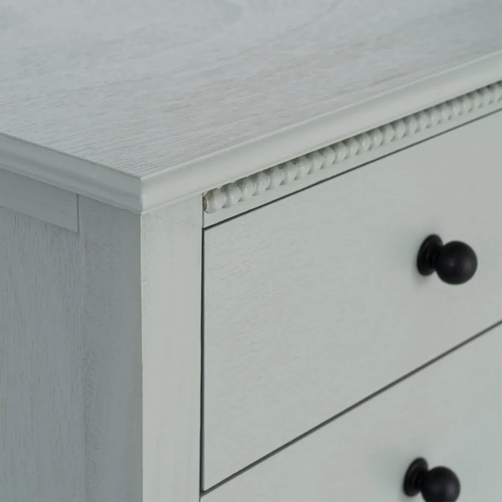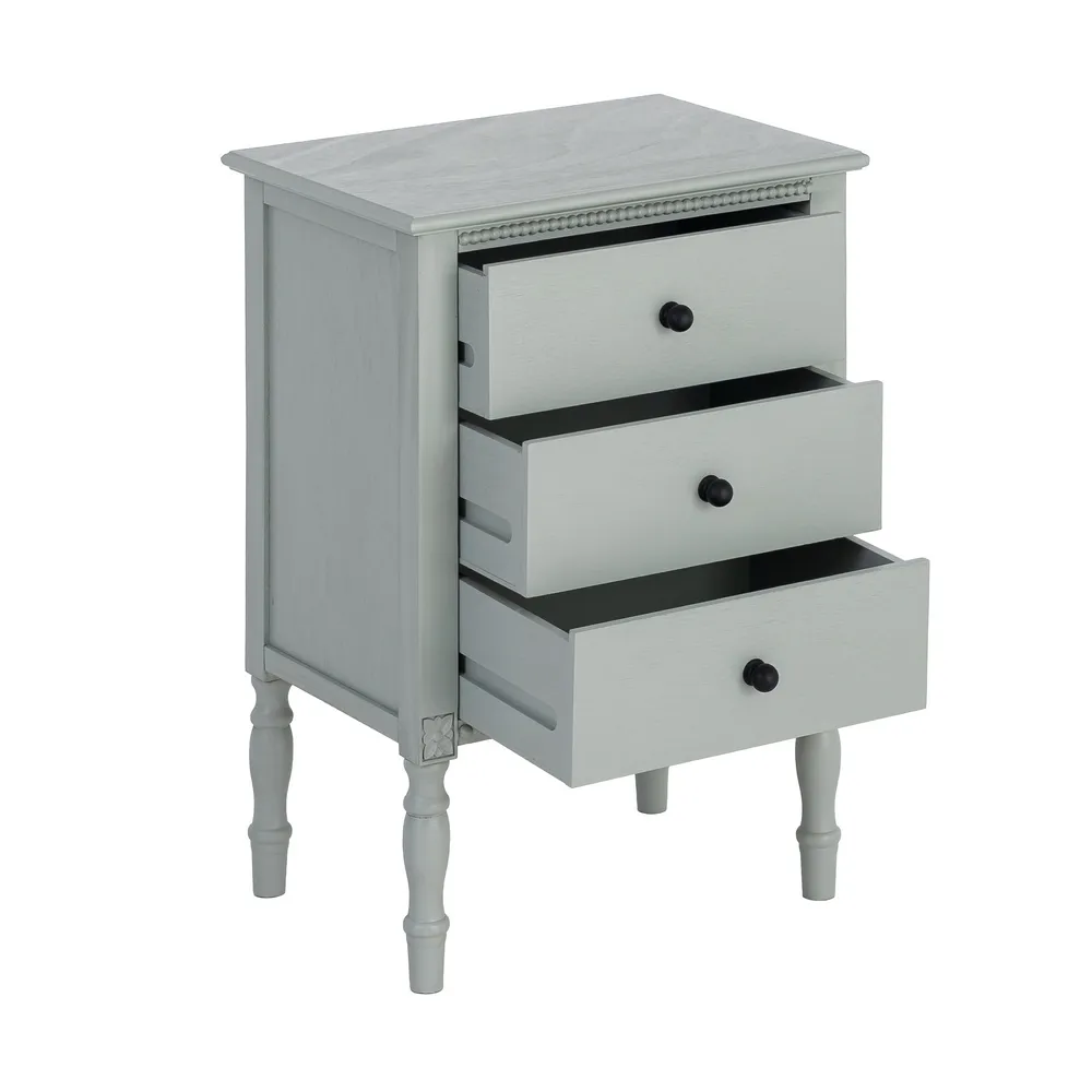 Noptiera este realizată din MDF și lemn de pin, are trei sertare pentru organizare eficientă, picioare înalte de 18 cm, finisaj verde deschis și dimensiuni totale de 43 x 33 x 61 cm.