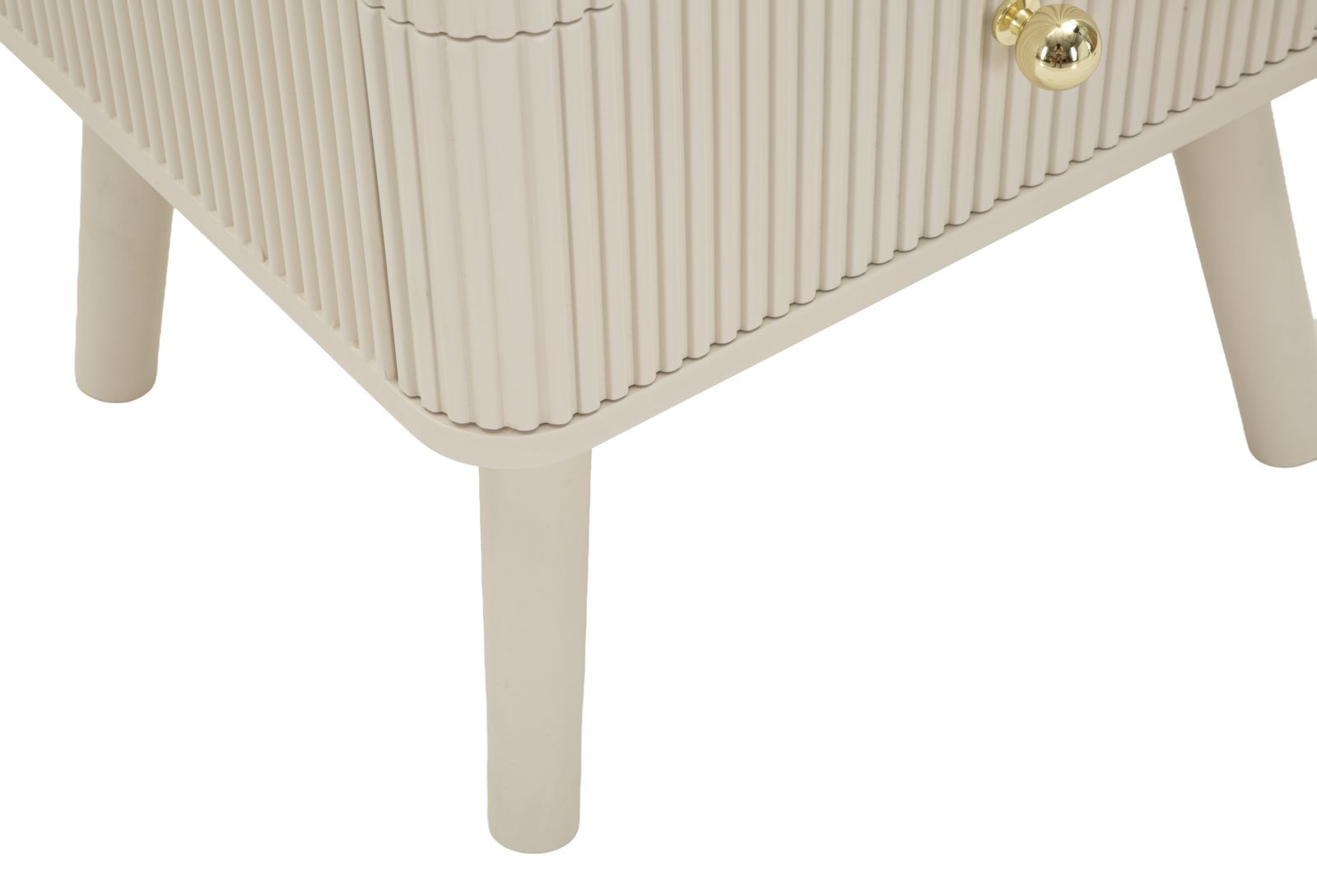 Picioarele conice ușor înclinate conferă mobilierului un aspect aerisit și elegant, ridicând vizual piesa și oferind stabilitate. Textura verticală a sertarelor adaugă ritm designului, transformând această noptieră într-un element discret dar plin de caracter.