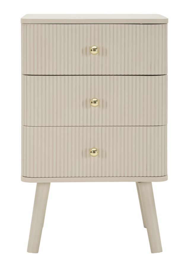Noptiera Shy cu trei sertare impresionează prin designul său modern și echilibrat, unde liniile simple se îmbină cu detalii decorative subtile. Finisajul alb luminos este completat de mânerele aurii elegante, iar fronturile cu textură verticală creează un joc vizual rafinat care adaugă profunzime și personalitate piesei.