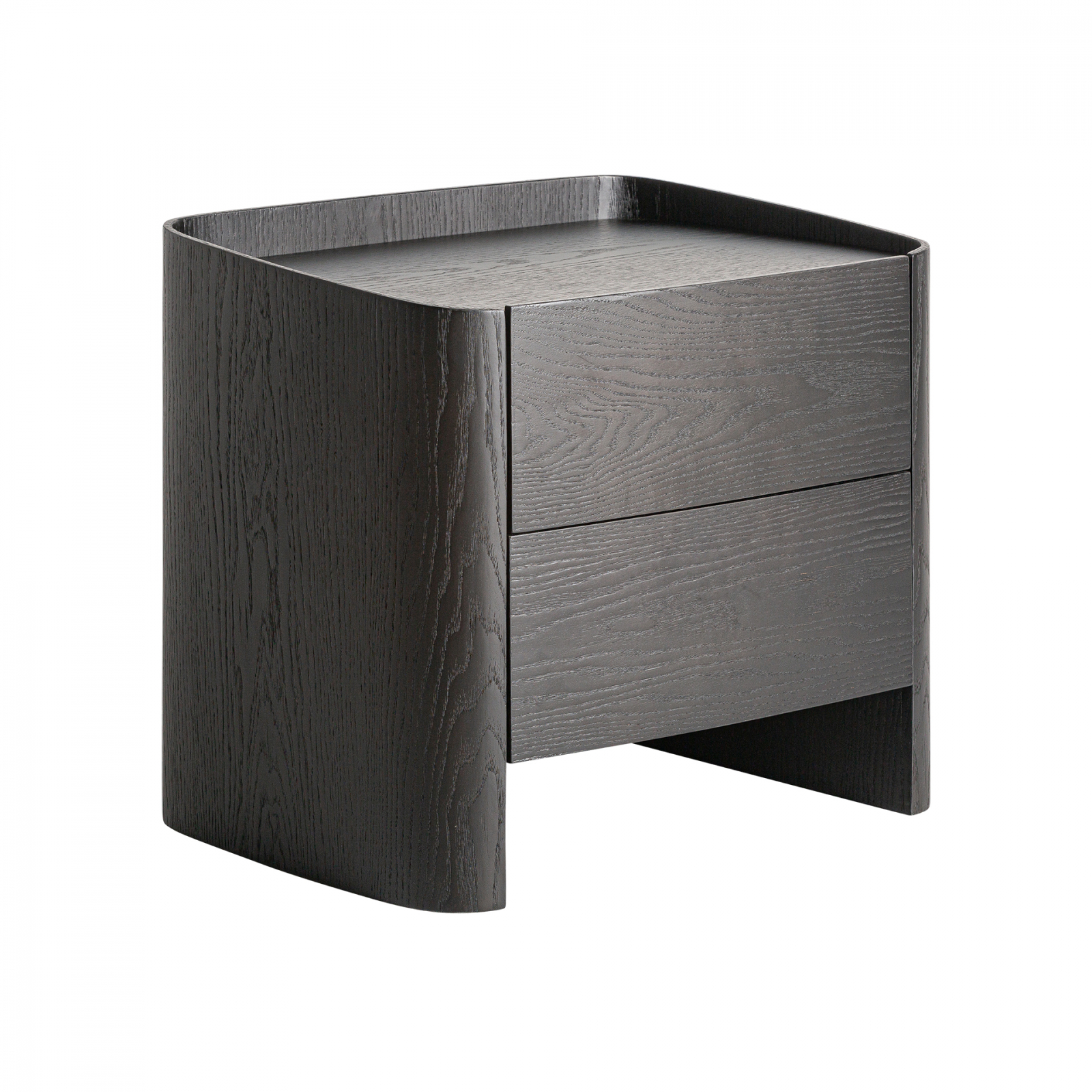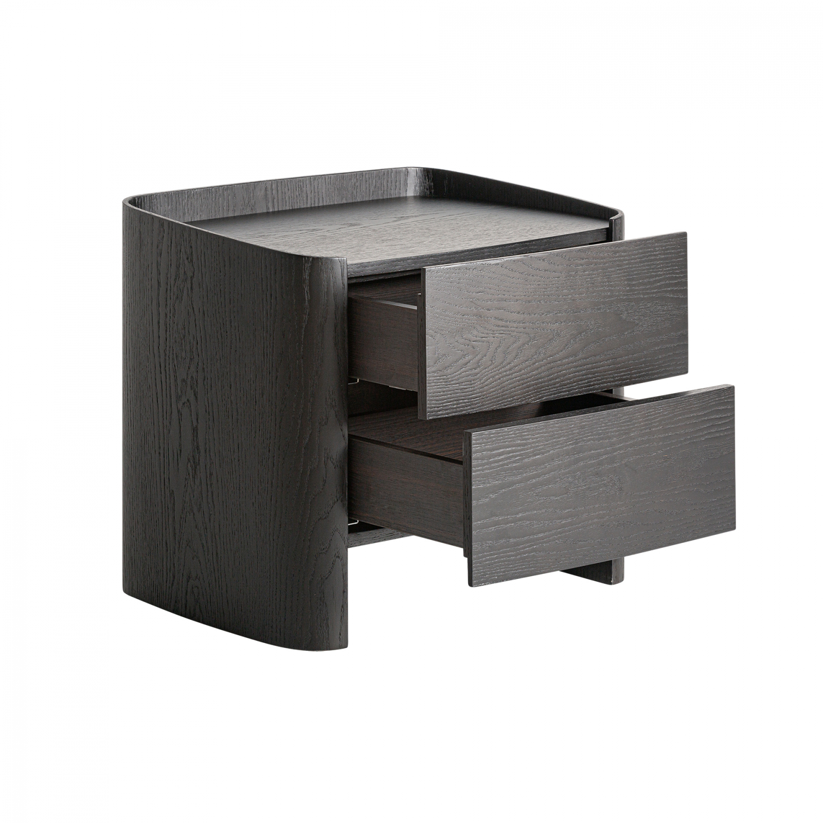 Noptiera Art Deco din lemn stratificat negru si furnir de stejar. Design sofisticat pentru dormitor elegant. Noptiere luxoase cu contrast intre modern si natural.