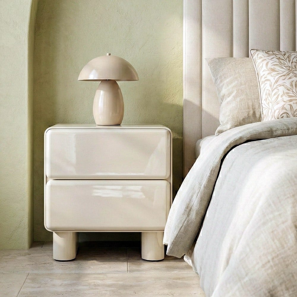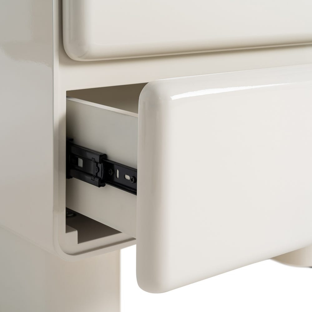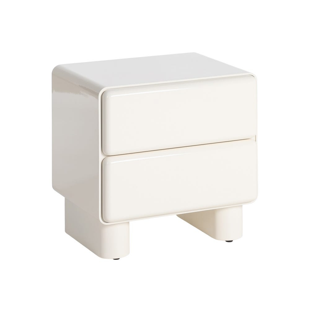 Această noptieră se evidențiază printr-un design minimalist sculptural, cu volume compacte și colțuri rotunjite, concepută pentru dormitoare contemporane în care estetica este la fel de importantă ca funcționalitatea. Finisajul lăcuit crem accentuează forma monolitică și conferă piesei o prezență calmă și elegantă în spațiu.