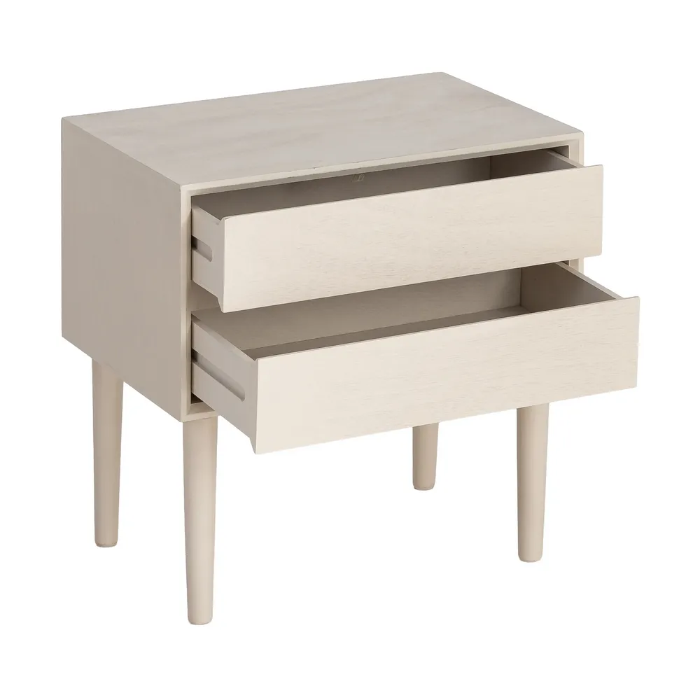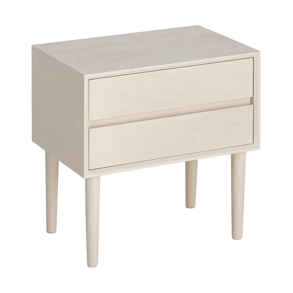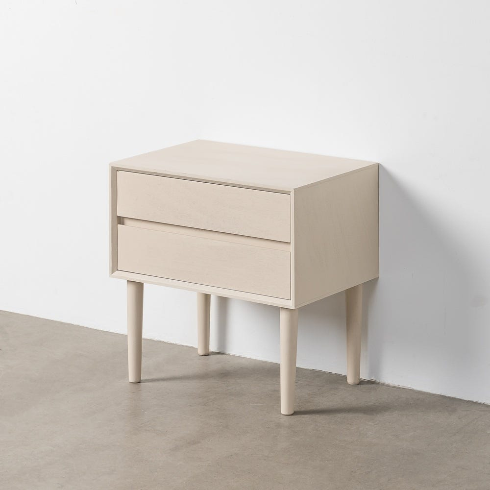 Picioarele cilindrice, finisate în aceeași nuanță crem, ridică ușor corpul mobilierului și contribuie la o prezență vizuală aerisită. Dimensiunile compacte permit amplasarea noptierei lângă pat sau utilizarea ei ca piesă auxiliară într-un dormitor cu estetică minimalistă.