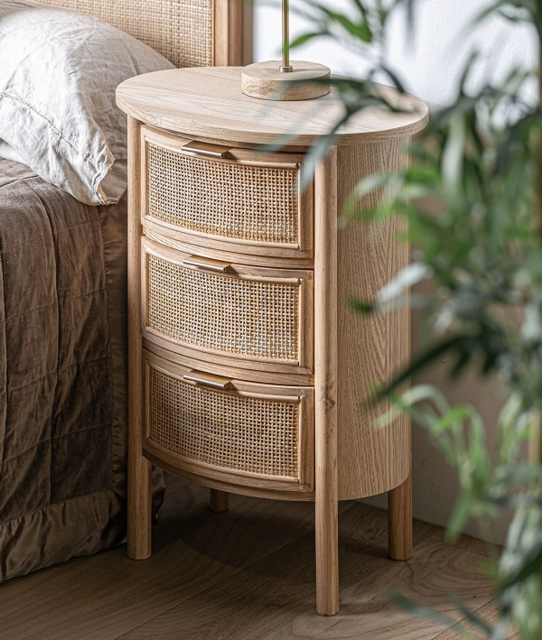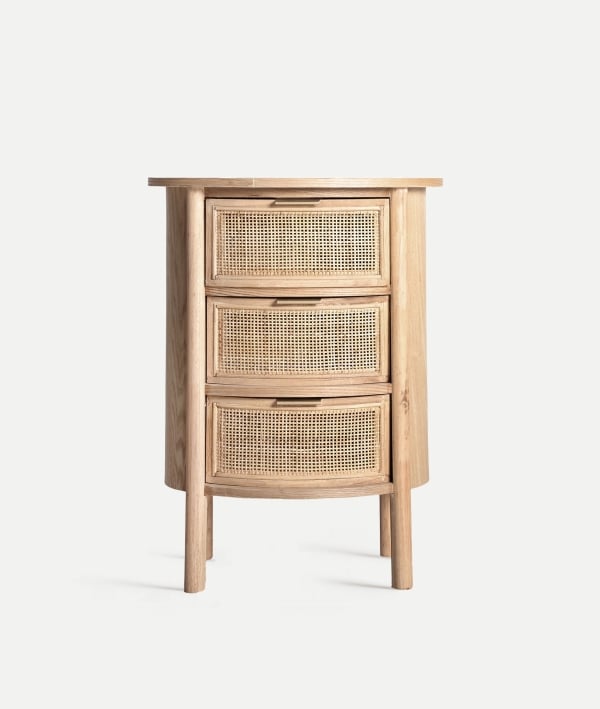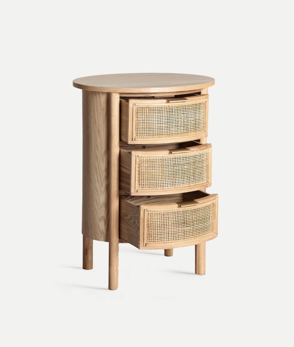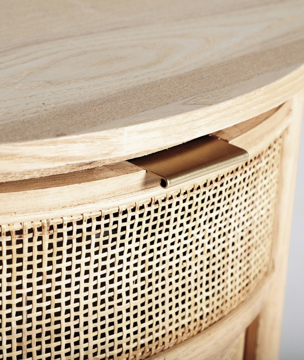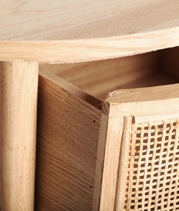 Cu detaliile sale artizanale și formele blânde, IKLA adaugă un farmec natural spațiului de dormit. Ideală pentru interioare scandinave, boeme sau mediteraneene, această noptieră oferă spațiu generos de depozitare fără a compromite stilul. Textura caldă a ratanului se îmbină perfect cu suprafața netedă a lemnului, creând o atmosferă relaxată și armonioasă.