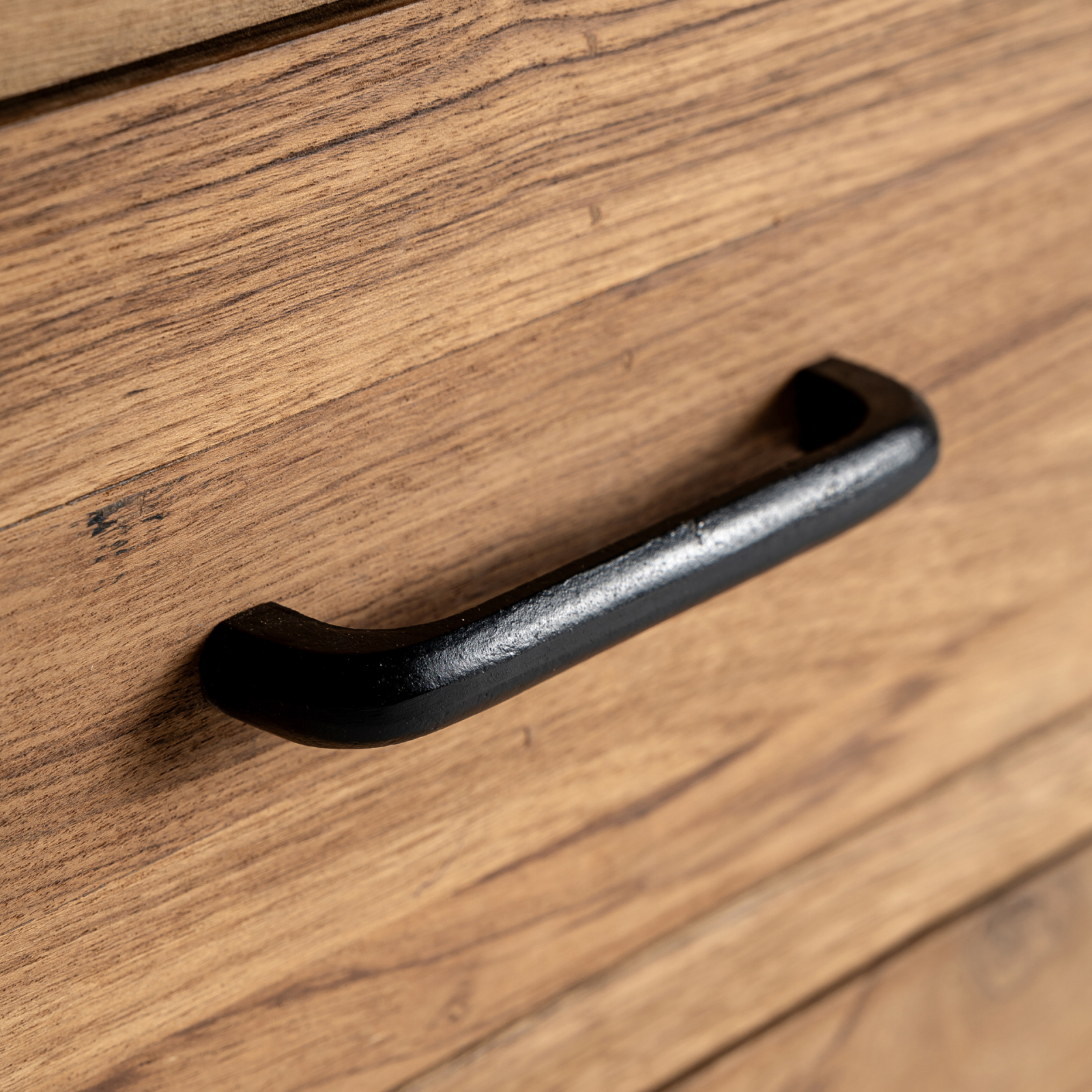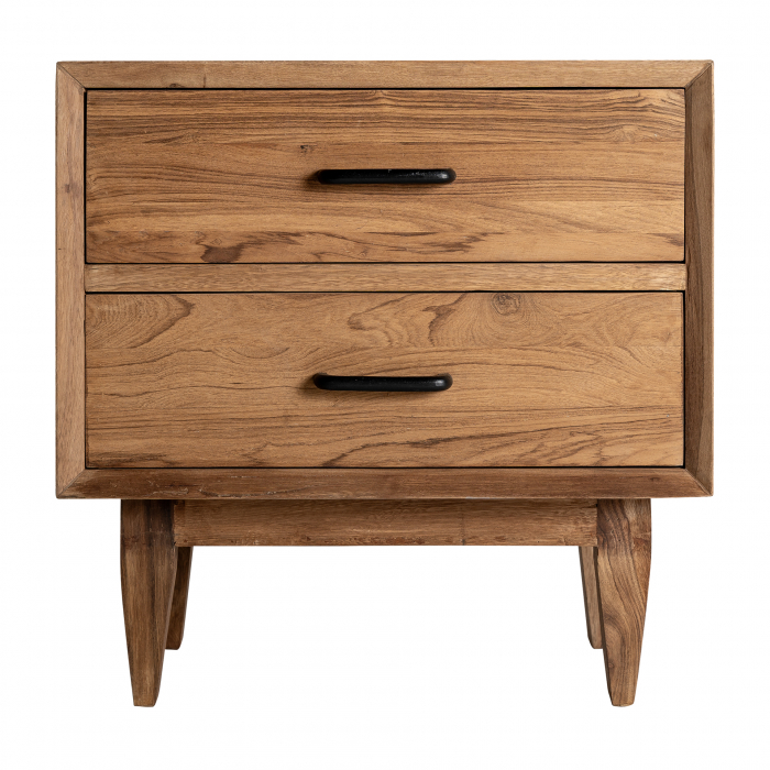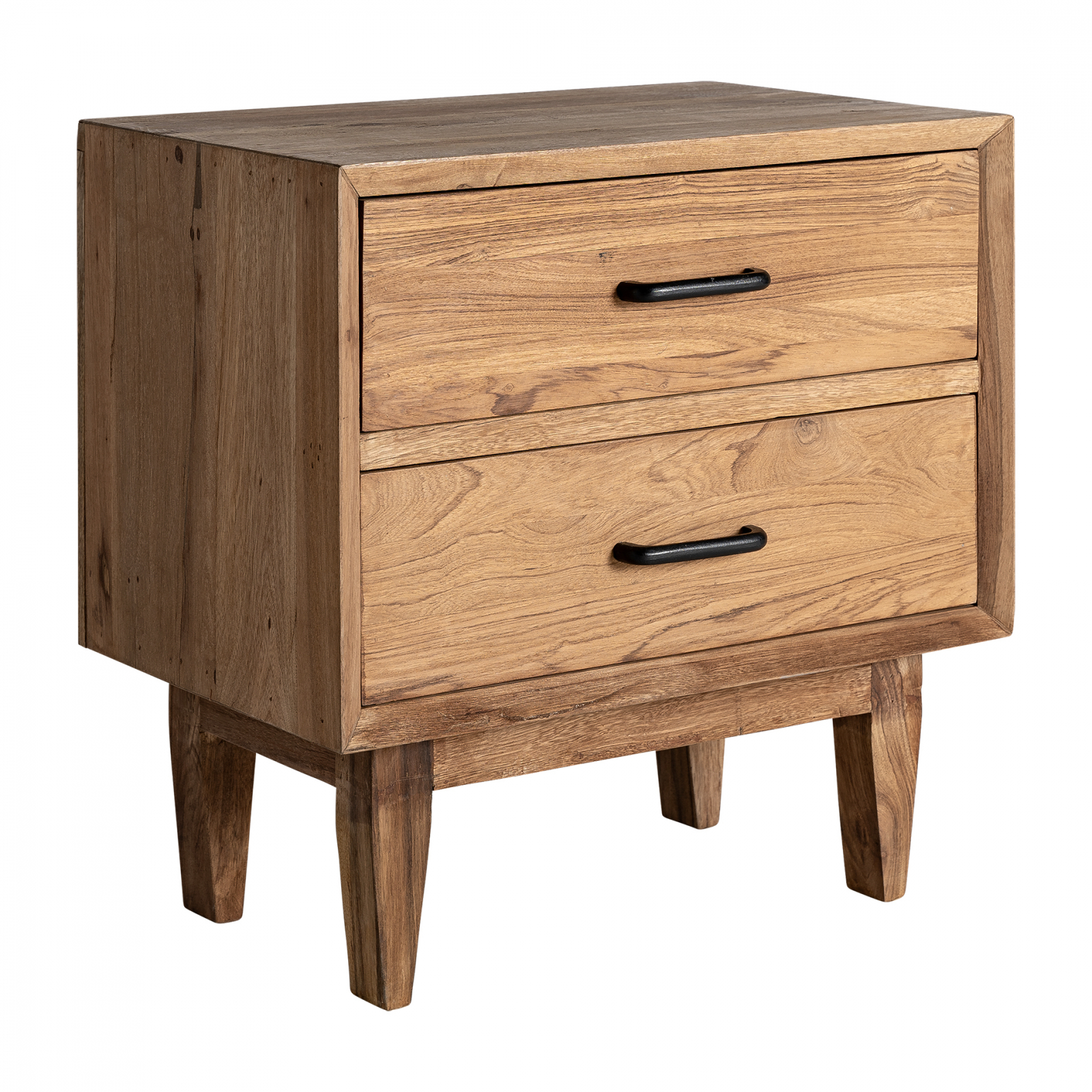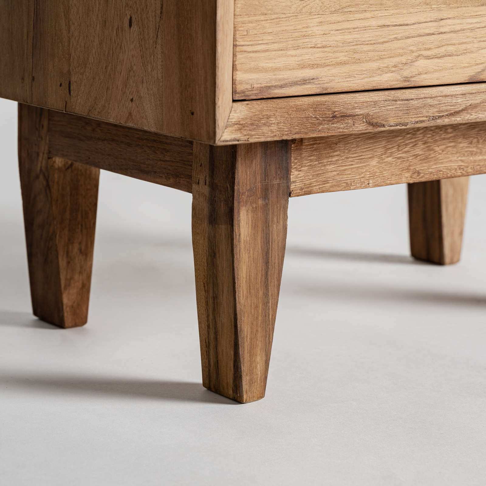 Noptieră scandinavă din lemn recuperat, cu aspect organic și cald. Design nordic pentru dormitor autentic. Noptiere sustenabile, ideale pentru accente elegante.