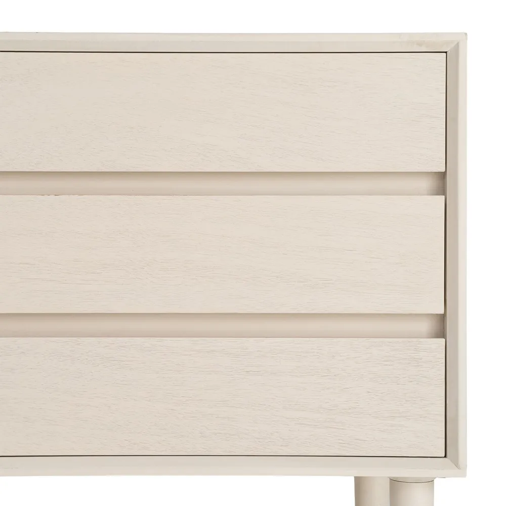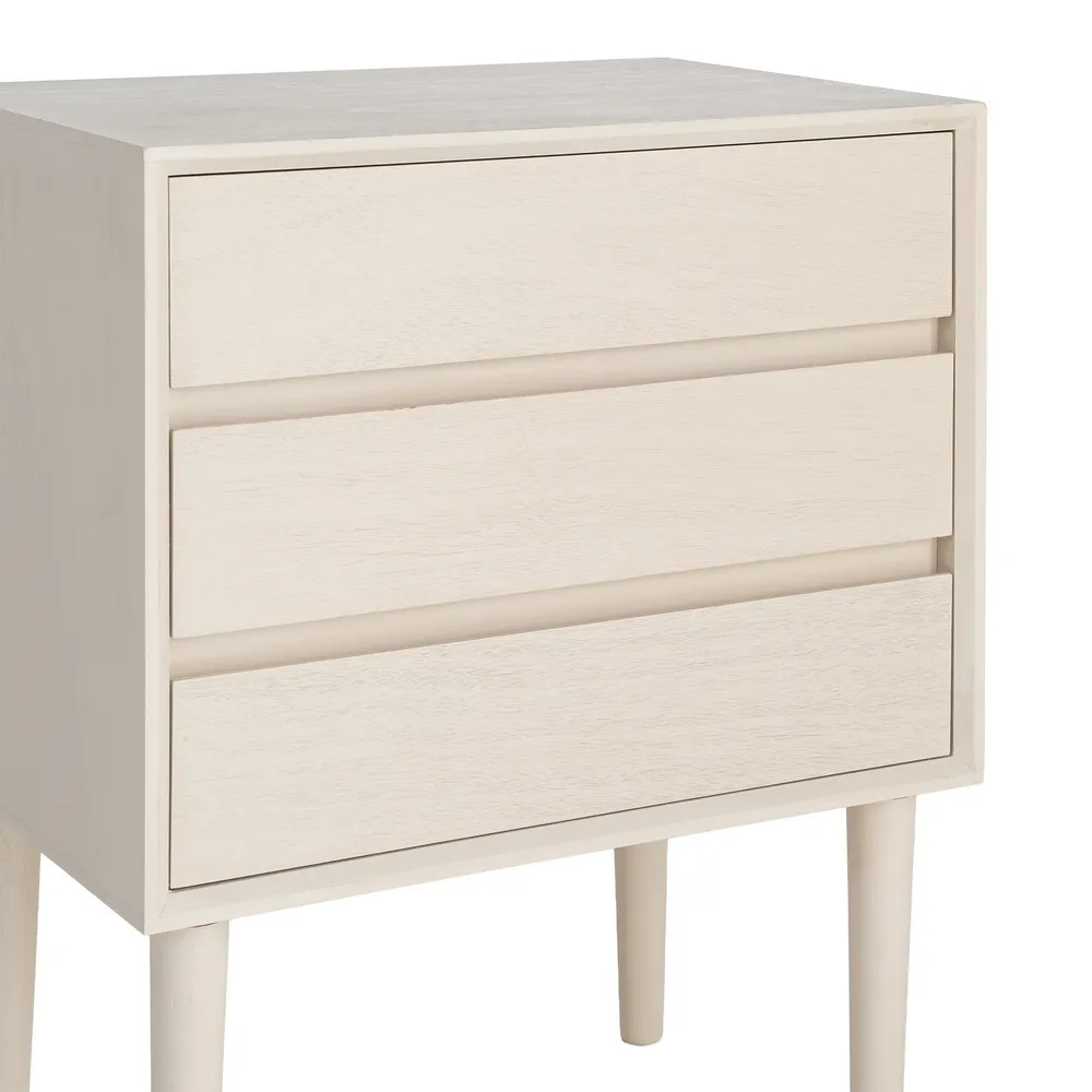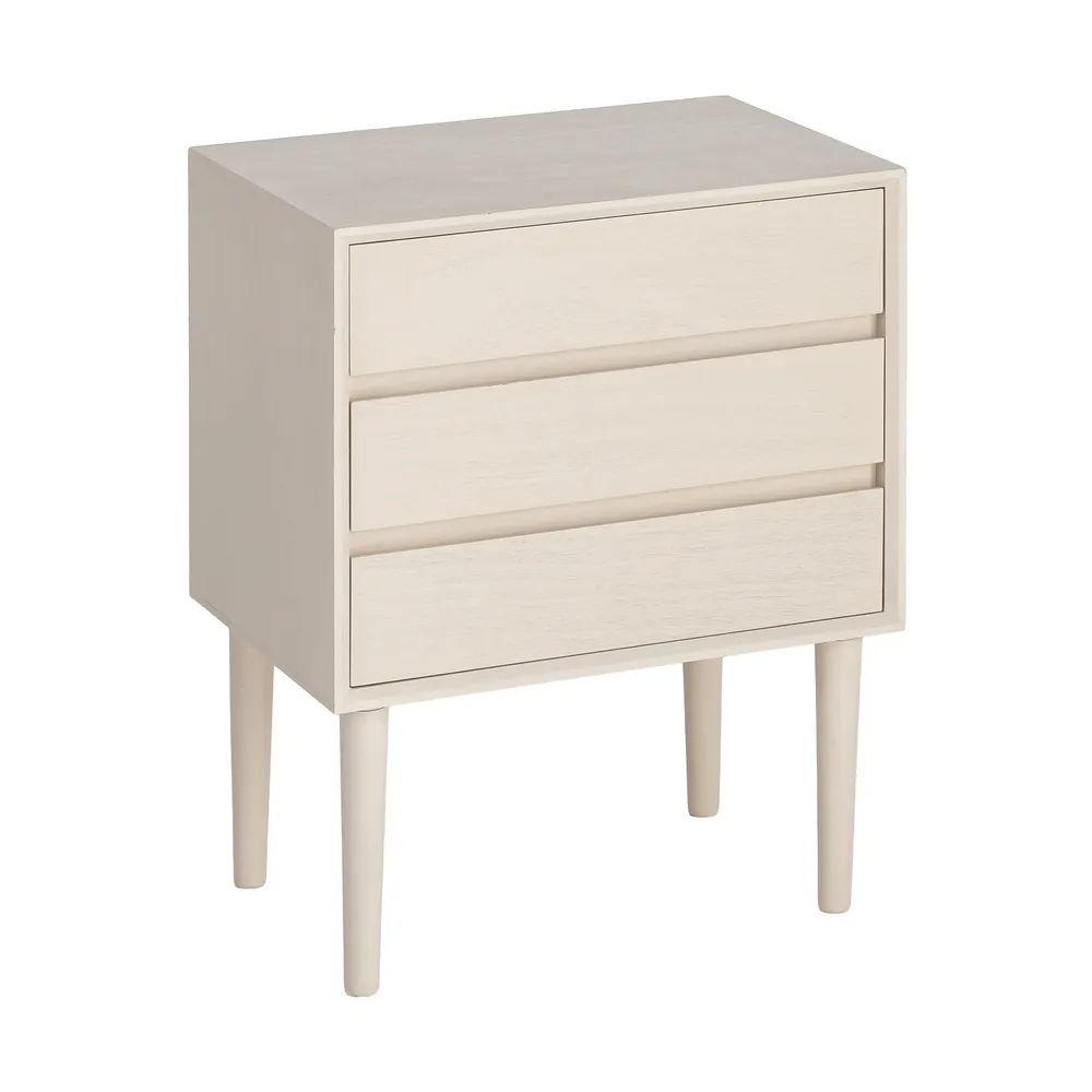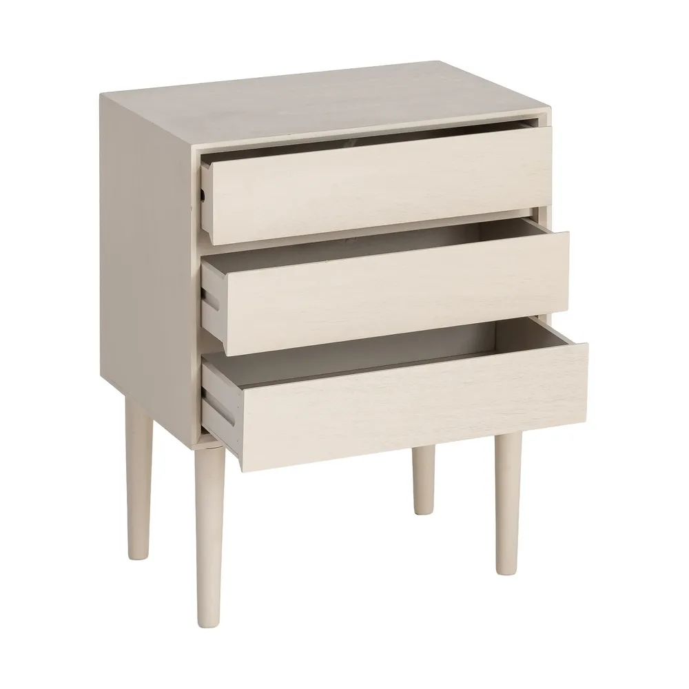 Picioarele cilindrice, finisate în aceeași nuanță crem, ridică ușor corpul mobilierului și contribuie la o prezență vizuală aerisită. Dimensiunile permit utilizarea noptierei ca piesă de depozitare lângă pat, menținând un echilibru între utilitate și estetică.