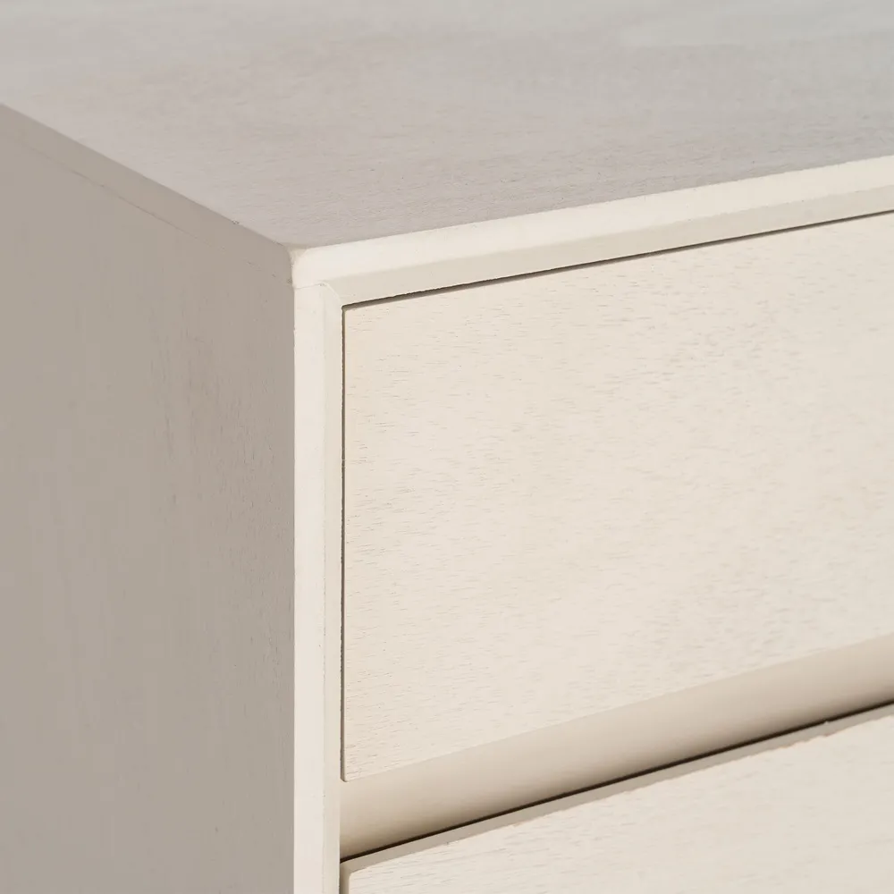 Corpul noptierei este realizat din MDF și include trei sertare cu fronturi netede, fără mânere vizibile, pentru un aspect curat și uniform. Designul pune accent pe continuitatea suprafețelor și pe proporțiile bine definite, fără elemente decorative suplimentare.