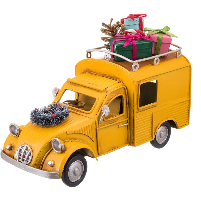 Această dubă galbenă din metal, cu dimensiunile de 16,50 X 6,50 X 10,50 CM, este un accesoriu perfect pentru a adăuga un plus de originalitate decorului tău de Crăciun. Cu un design vesel și detalii festive, precum cadourile și ghirlandele decorative, acest obiect este ideal pentru a crea o atmosferă caldă și primitoare în orice colț al casei tale. Îmbogățește-ți colecția de decorațiuni Crăciun și transformă-ți locuința într-un spațiu plin de farmec festiv doar cu CreativDeco!