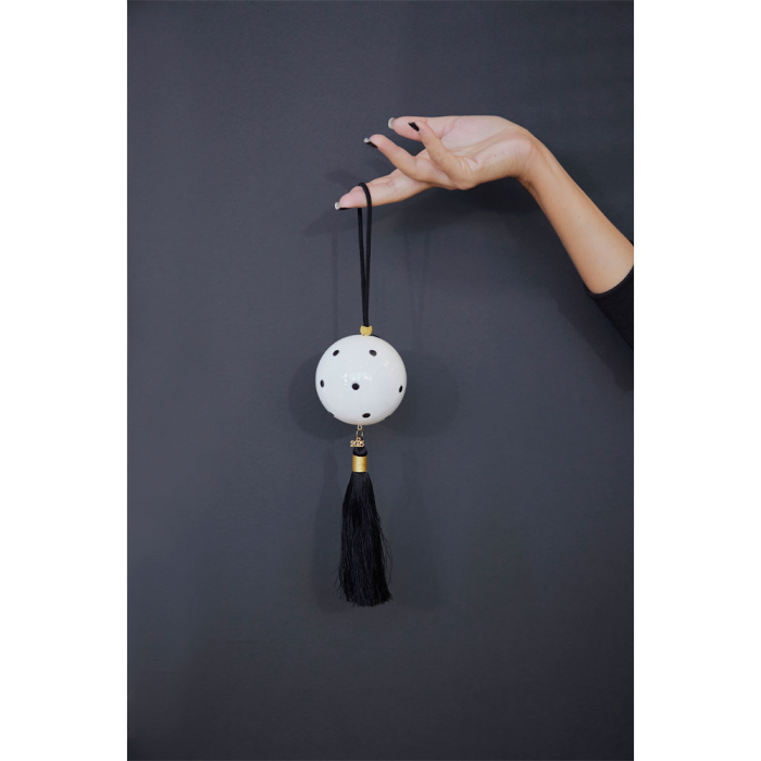Modelul XMAS BALL DOTS CHARM este ideal pentru a fi suspendat pe mânere de ușă, tocuri de ferestre, brad decorativ sau în colțuri accent. Ciucurele lung și panglica subțire neagră adaugă o notă senzuală și rafinată, specifică decorurilor orientale sau modern-glam.