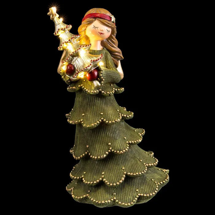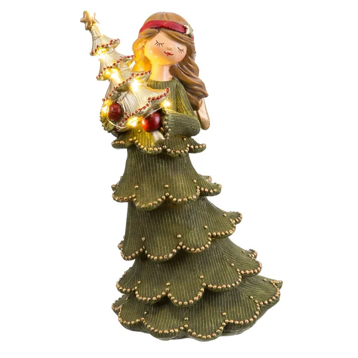 Acest înger adorabil este confecționat din rășină de înaltă calitate și este îmbrăcat într-o rochie verde elegantă, decorată cu detalii aurii. Ținând în brațe un brad luminos, oferă o strălucire caldă, ideală pentru a crea o atmosferă festivă în casa ta. Cu dimensiunile de 14,50 X 11,50 X 23,50 CM, funcționează cu 2 baterii CR2032 (incluse), asigurând iluminarea de sărbătoare pe tot parcursul sezonului. Acest produs CreativDeco este perfect pentru a adăuga un element de magie și eleganță la decorul tău de Crăciun.