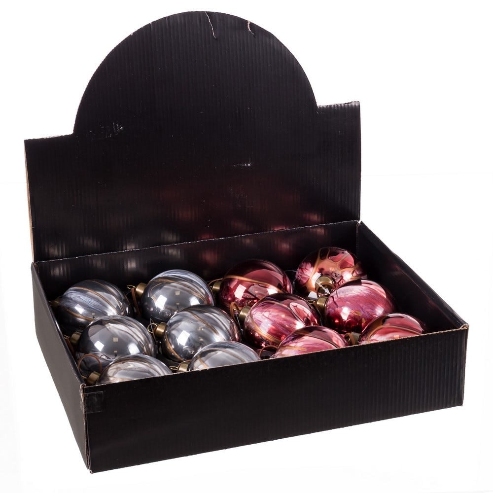 Setul de 12 globuri din sticlă cu efect marmorat în nuanțe de roșu și gri adaugă rafinament și profunzime decorului de Crăciun. Cu un finisaj lucios și detalii inspirate din texturile naturale de piatră, aceste decorațiuni creează o atmosferă elegantă, perfectă pentru un brad modern și sofisticat.