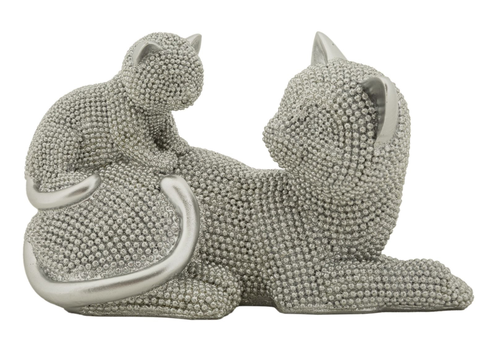 Set 2 statuete pisică argintie cu pui din rășină Gatto Sparky – două figurine din rășină cu finisaj argintiu texturat, reprezentând o pisică și puiul ei; suprafață granulată cu aspect lucios, dimensiuni totale 19 × 9 × 13 cm.