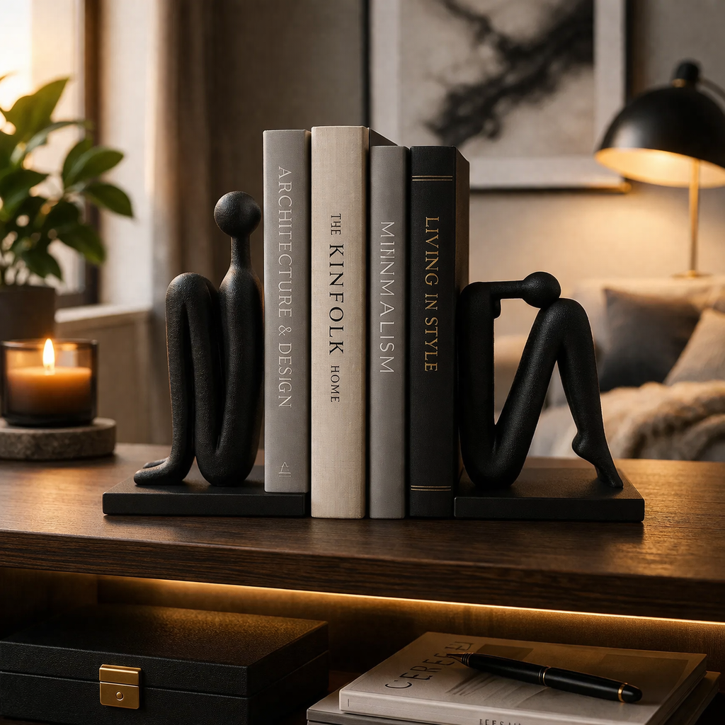 Setul conține 2 suporturi decorative pentru cărți, fiecare având forma unei siluete umane stilizate.