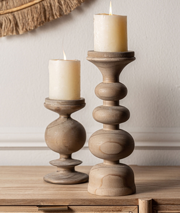 FELLIH este un set de două suporturi de lumânare cu design sculptural, inspirate din stilul colonial. Realizate din lemn de pin maro, cu inserții metalice din fier, aceste piese adaugă o notă caldă și elegantă oricărui decor — fie că le folosești pe o masă de dining, o comodă sau o consolă.