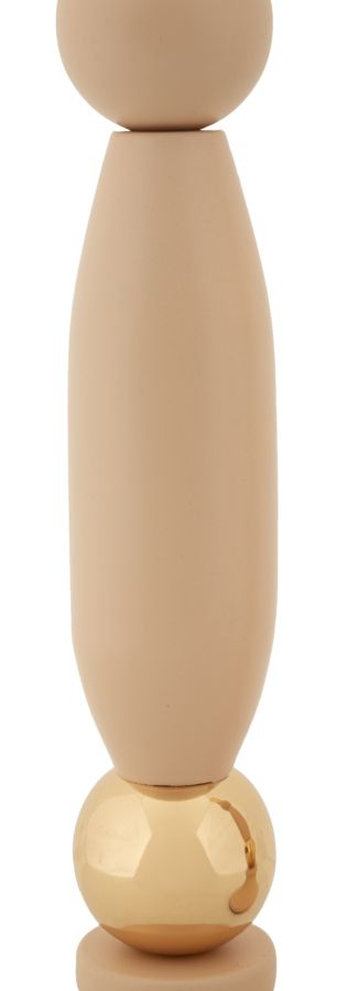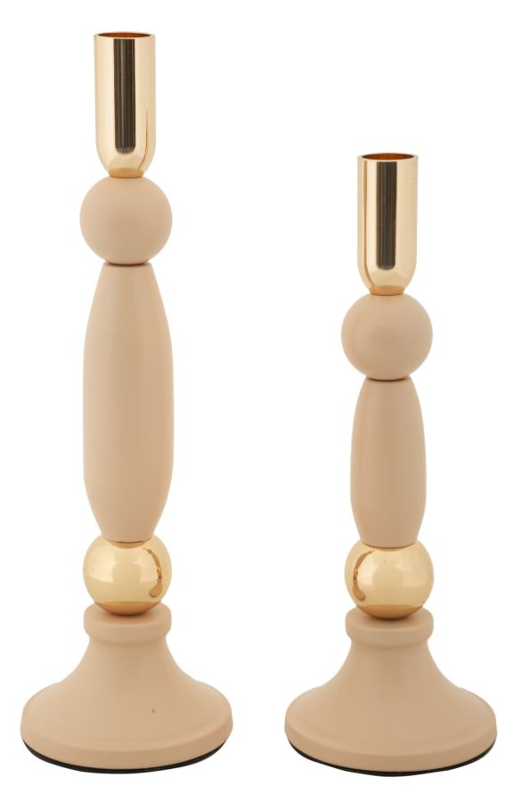 Acest set de sfeșnice atrage privirea prin designul său rafinat, unde liniile verticale se îmbină armonios cu formele sferice și cu accentele aurii. Nuanța roz pudrat, discretă și elegantă, adaugă un plus de delicatețe, în timp ce finisajul metalic lucios conferă un aer sofisticat și modern.