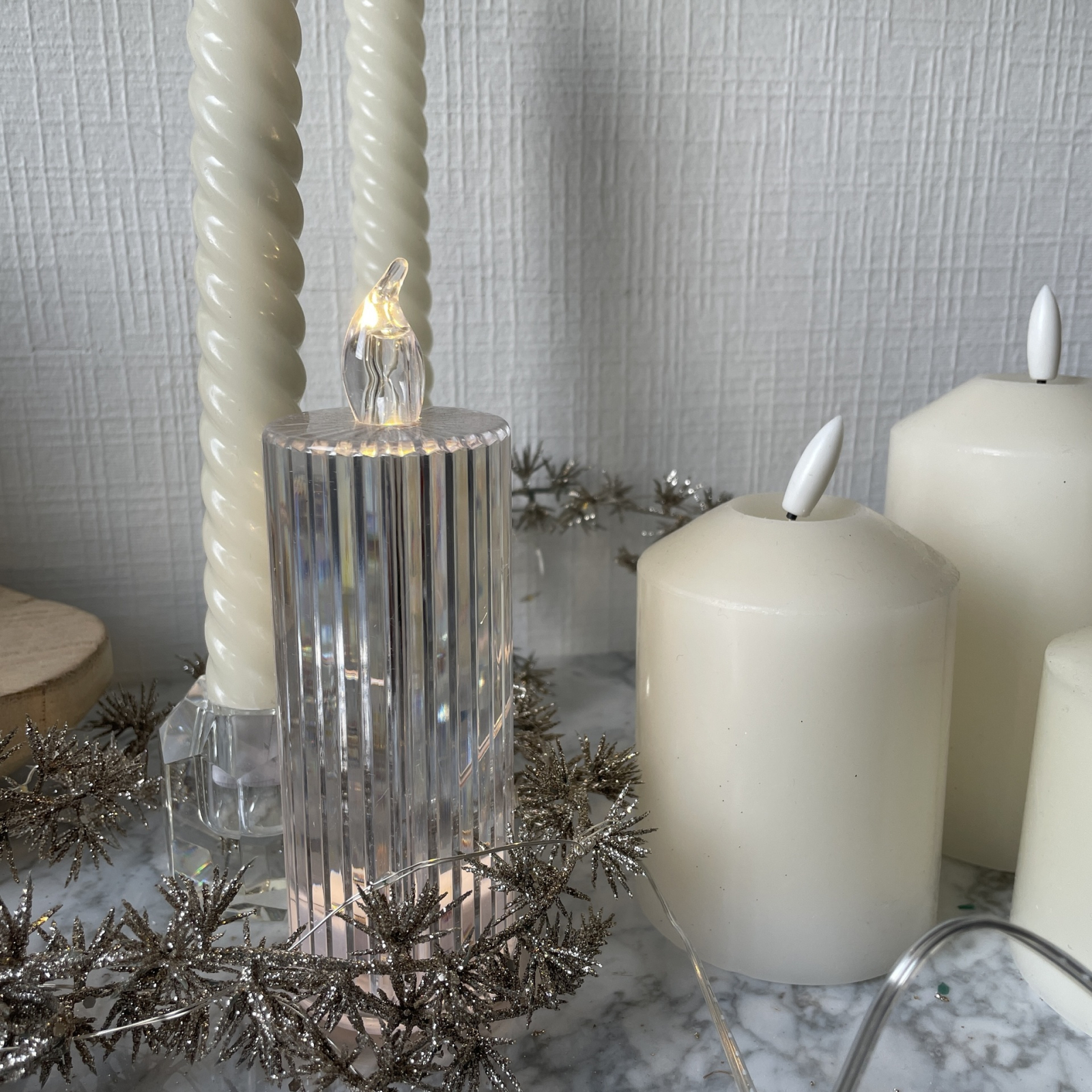 Un set de 5 lumânări LED cu design striat și transparență elegantă, ideal pentru decoruri festive, mese aranjate cu gust sau colțuri cozy, cu lumină caldă și sigură.