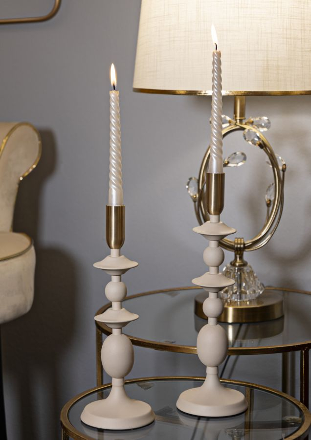 Sfeșnicele din colecția Gemini impresionează prin jocul de forme sculpturale și prin contrastul armonios dintre finisajul crem mat și detaliile aurii satinate. Aceste piese de decor sunt concepute pentru a adăuga un accent sofisticat și plin de stil atât meselor festive, cât și decorului zilnic al locuinței.
