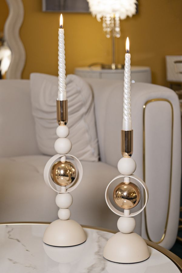 Diferența de înălțime dintre cele două sfeșnice creează dinamism, iar sfera aurie încadrată de inel aduce un joc subtil de lumini atunci când lumânarea este aprinsă. Fie așezate împreună ca piesă centrală, fie distribuite în același spațiu, cele două elemente compun o scenografie coerentă și plăcută.
