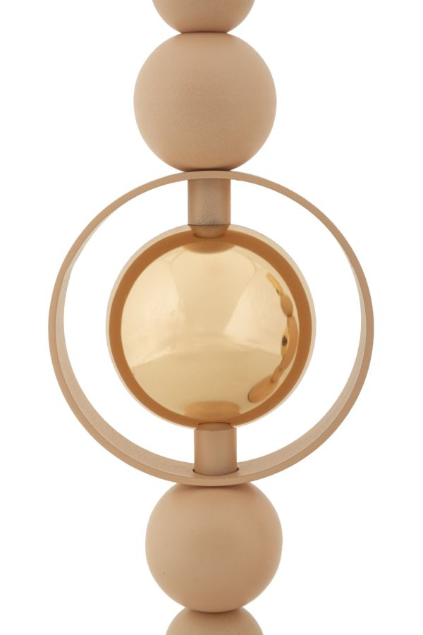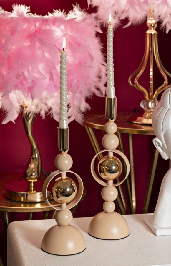 Setul Saturno în nuanță roz pudră îmbină armonios forme geometrice elegante cu detalii aurii lucioase. Cele două sfeșnice, cu înălțimi diferite, se completează reciproc și adaugă dinamism spațiului. Sfera aurie încadrată de inel oferă o notă sofisticată, iar baza stabilă, în formă de semidom, le face potrivite pentru masă, consolă sau bibliotecă.