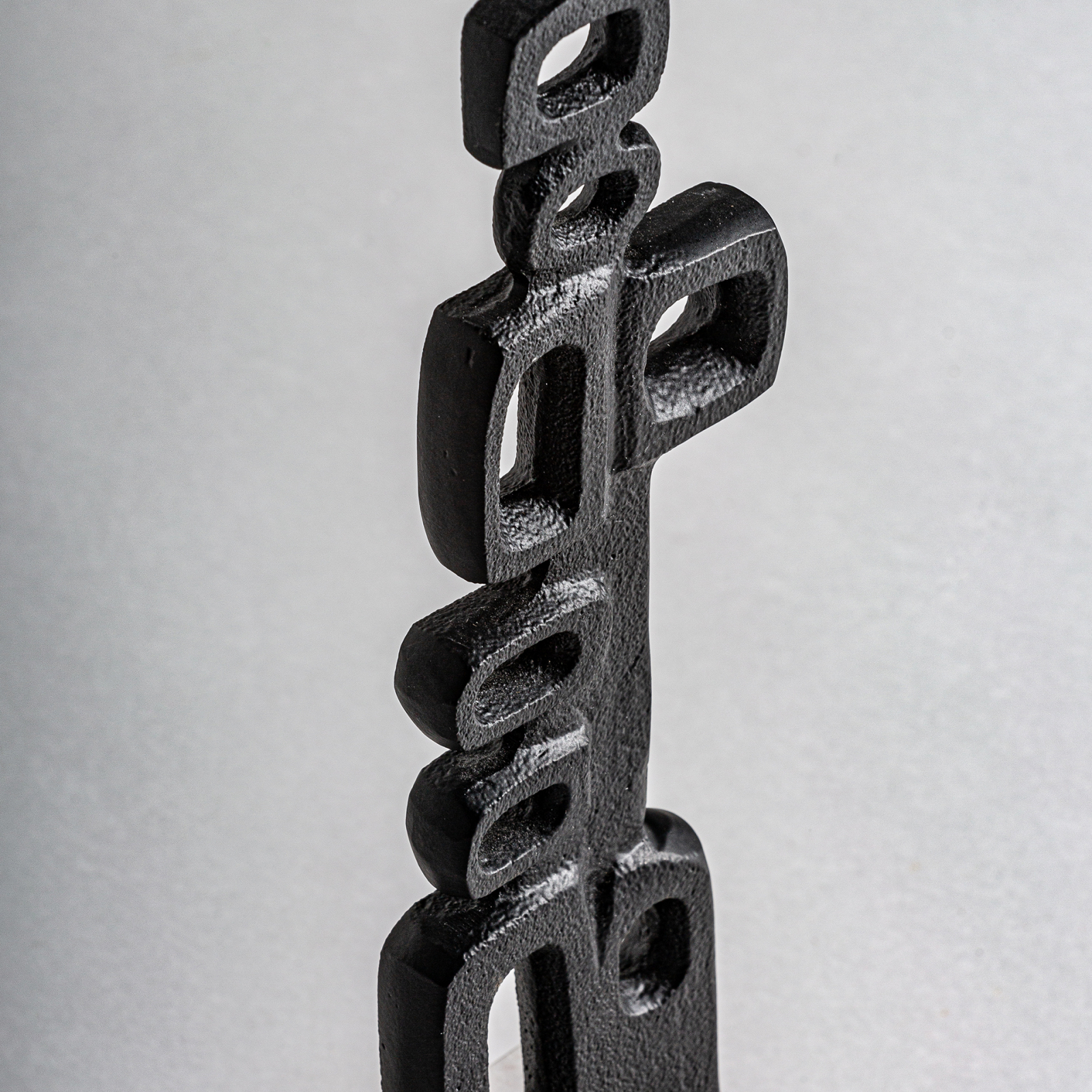 Statuetă decorativă contemporană din aluminiu și marmură, în alb și negru. Design vertical elegant, oferind un contrast puternic și sofisticat. Joc interesant între texturi și materiale, cu o prezență grațioasă în interioare moderne.