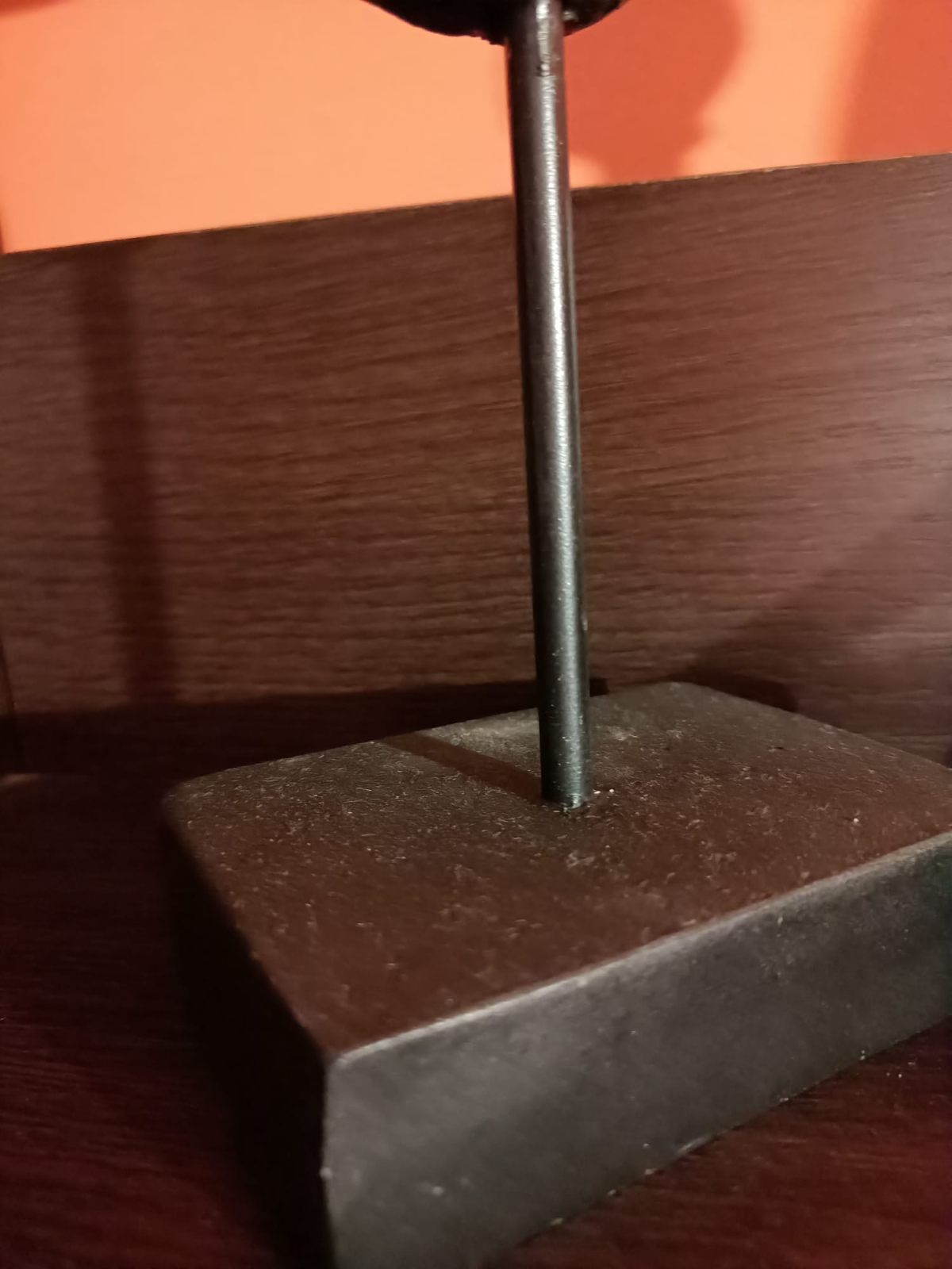 Statueta este montată pe o tijă subțire și fixată pe o bază dreptunghiulară stabilă.