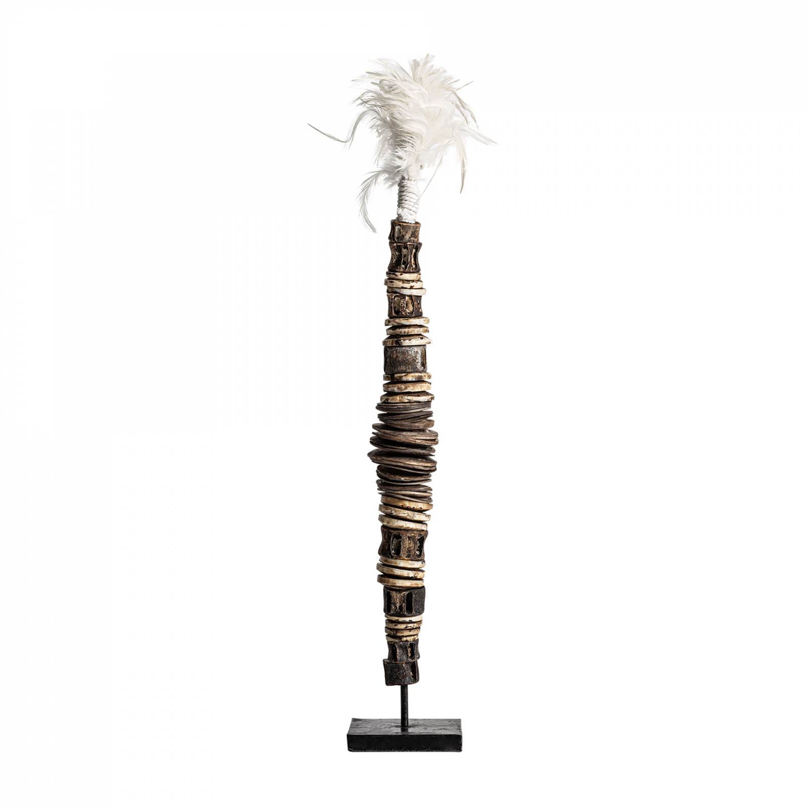 Statuetă etnică elegantă din fier și scoici, cu design vertical grațios. Aduce un aer autentic și primitiv în orice interior.