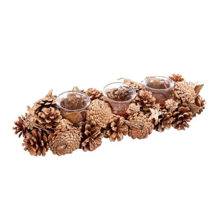 Acest suport pentru 3 lumânări din conuri de brad și stele, cu dimensiunile de 38,50 X 14,50 X 8,50 CM, este perfect pentru a aduce un aer natural și festiv în decorul tău de Crăciun. Realizat cu detalii naturale, conuri de brad și accente strălucitoare, acest suport este ideal pentru mesele festive și pentru a crea o atmosferă caldă și primitoare. Potrivit pentru decorațiuni de Crăciun, fie pe masa de sărbători, fie ca piesă centrală într-un aranjament festiv, acest suport aduce eleganță și un farmec tradițional. Completează-ți colecția de decorațiuni interioare și accesorii de sărbători doar la CreativDeco!