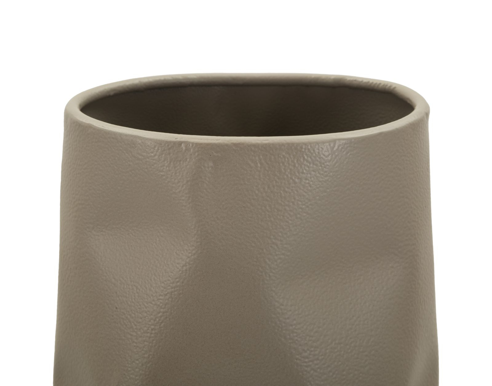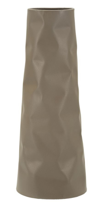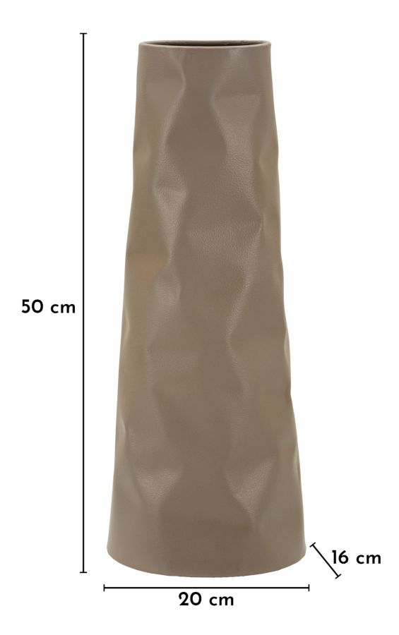 Vaza crem din fier cu suprafață texturată neregulată adaugă un accent modern-industrial prin silueta înaltă și prezența statement. Textura neregulată creează un joc subtil de lumini și umbre, iar finisajul crem echilibrează decorul. Se amplasează ușor pe pardoseală, consolă sau mobilier amplu pentru un punct focal clar.