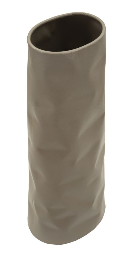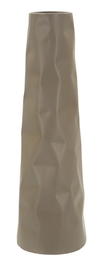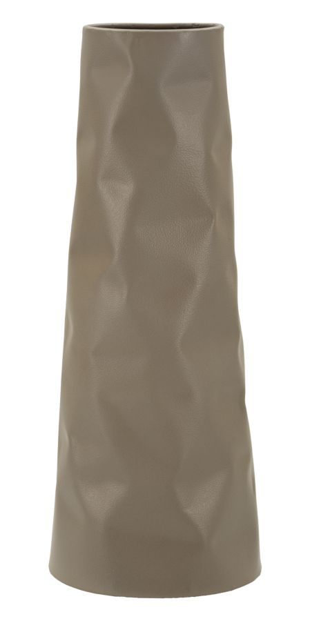 Forma ușor conică și suprafața texturată, cu aspect neregulat, creează un joc subtil de lumini și umbre pe întreaga înălțime a vazei. Finisajul crem adaugă echilibru vizual și permite integrarea facilă în interioare moderne, unde liniile curate sunt completate de texturi expresive.