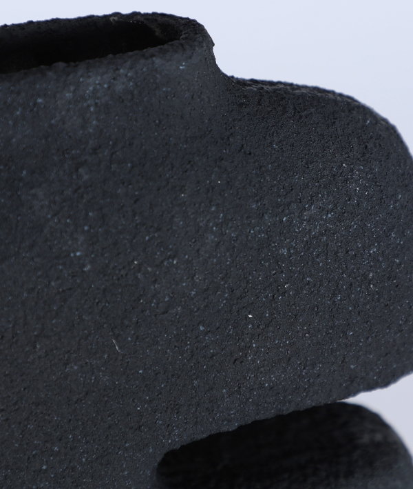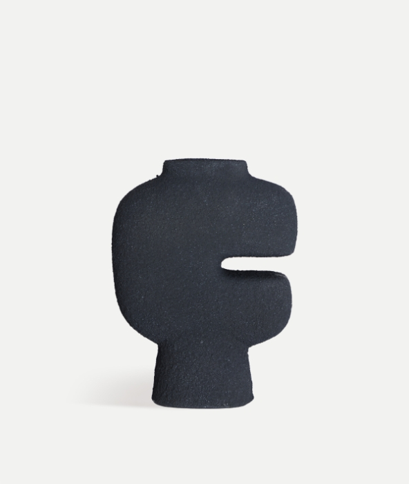 Vaza Niveo de la KODU impresionează prin silueta sculpturală și liniile organice care amintesc de forme abstracte contemporane. Finisajul rugos în negru mat oferă profunzime vizuală și o prezență puternică, transformând piesa într-un element decorativ cu impact, ideal pentru interioare moderne sau artistice.