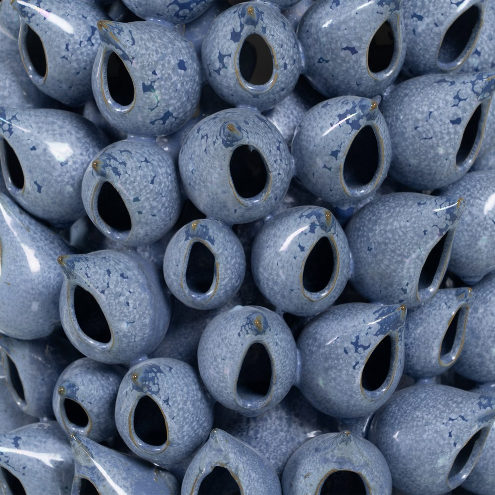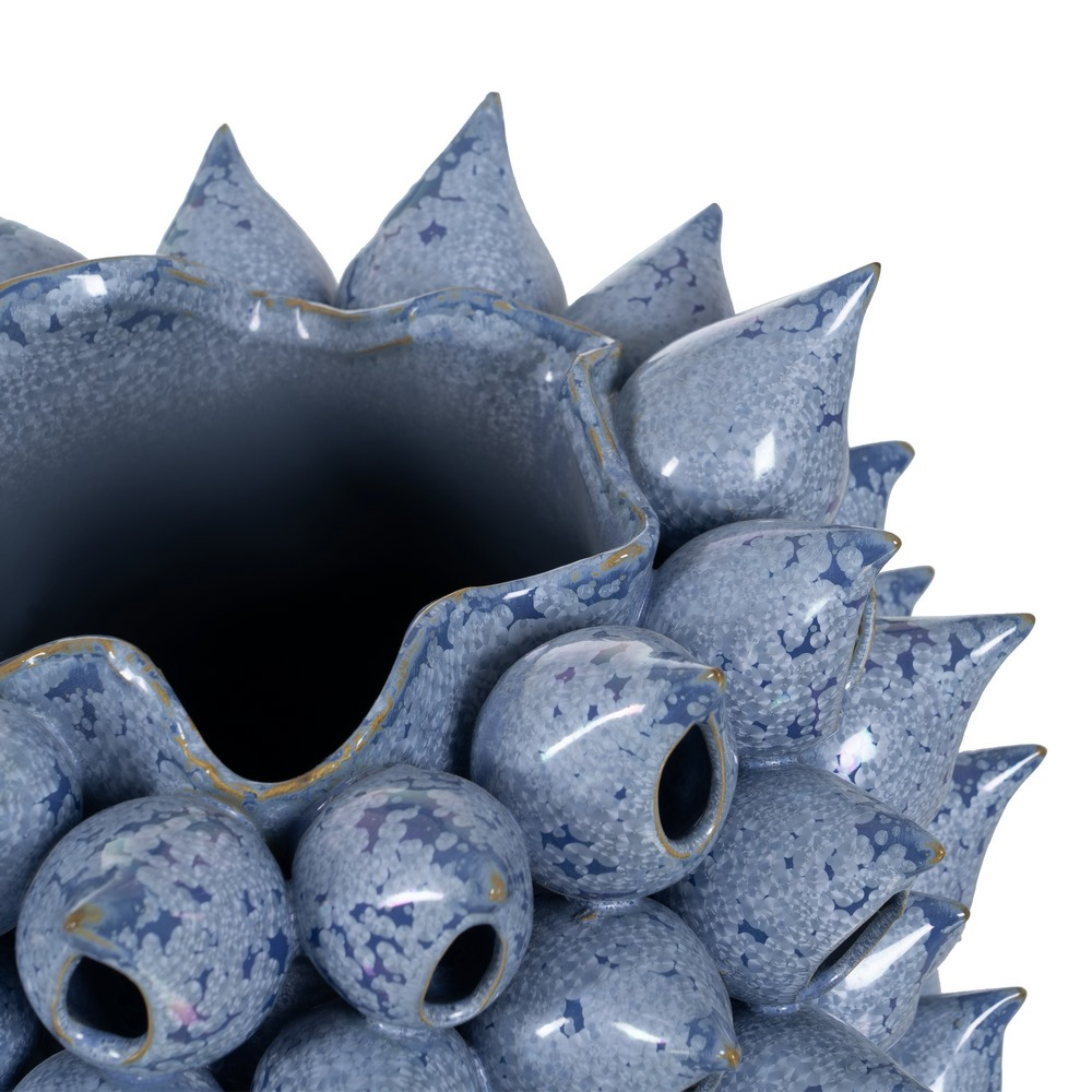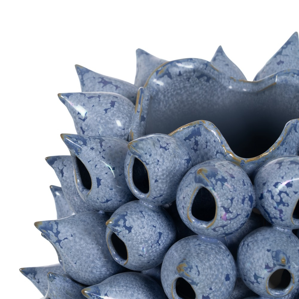 Un element decorativ de impact, această vază din ceramică albastră impresionează prin designul său sculptural și detaliile tridimensionale. Finisajul lucios scoate în evidență formele rotunjite și ascuțite care dau personalitate piesei. Cu dimensiuni generoase de 33,50 cm lungime, 33,50 cm lățime și 45 cm înălțime, acest vas adaugă un accent de originalitate în orice decor modern. Deschiderea vazei are un diametru de 14 cm.