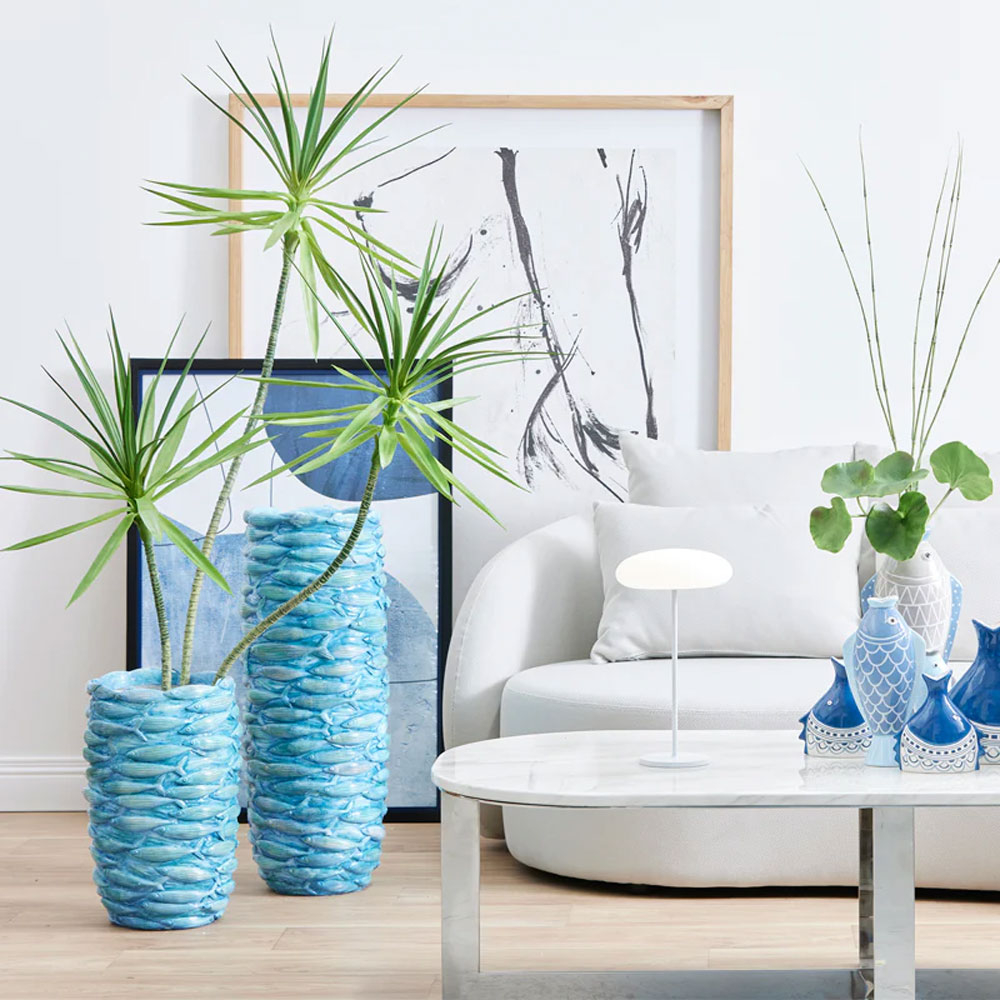 Vază decorativă cu volum sculptural și textură inspirată de valurile mării, ideală pentru interioare cu accente marine, coastal-chic, moderne sau mediteraneene. Modelul OCEAN se remarcă prin finisajul său intens albastru, cu irizații mate și lucioase care imită mișcarea apei, fiind o piesă centrală în orice decor ce evocă liniștea oceanului.