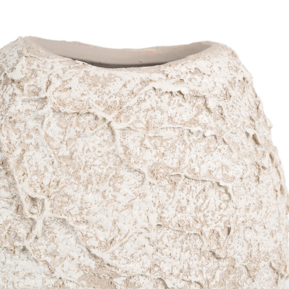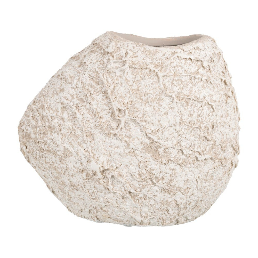 Suprafața este bogată în textură și prezintă un finisaj ușor neregulat, care oferă vazei un aspect autentic și cald. Nuanța de alb este ușor de integrat și completează armonios spațiile decorate în tonuri naturale, fără a încărca vizual.