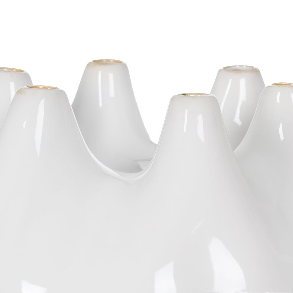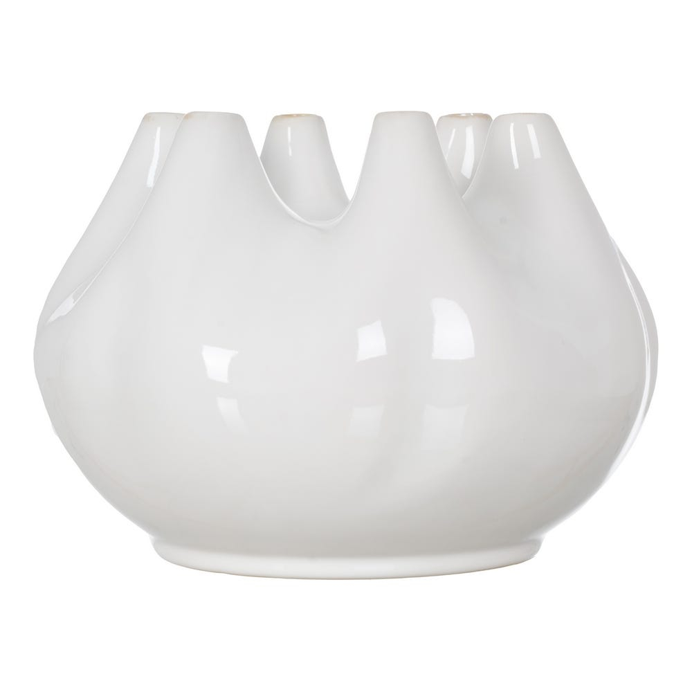 Această vază decorativă din ceramică albă aduce un aer modern și creativ în orice spațiu și se integrează ușor în amenajări contemporane sau minimaliste. Forma sa compactă este evidențiată de designul sculptural, cu mai multe deschideri dispuse armonios.