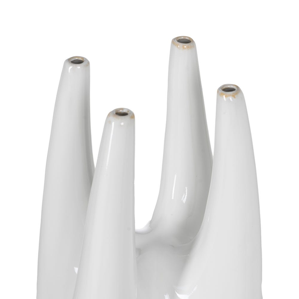 Această vază decorativă din ceramică albă aduce un aer modern și artistic în orice spațiu și se integrează ușor în amenajări contemporane sau minimaliste. Forma sa verticală este evidențiată de designul neobișnuit, cu mai multe deschideri subțiri, care creează un efect vizual elegant.