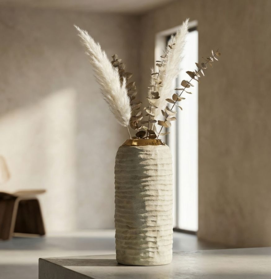 Această vază decorativă din ceramică impresionează prin echilibrul dintre sobrietatea finisajului mat și strălucirea elegantă a interiorului auriu. Nuanța gri discretă și textura ușor reliefată oferă piesei un caracter contemporan, în timp ce marginea aurie adaugă o notă rafinată care atrage subtil privirea. Este un obiect decorativ potrivit pentru livinguri elegante, holuri moderne sau spații HoReCa unde detaliile sofisticate definesc atmosfera.