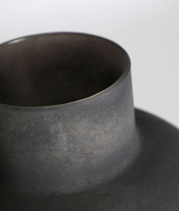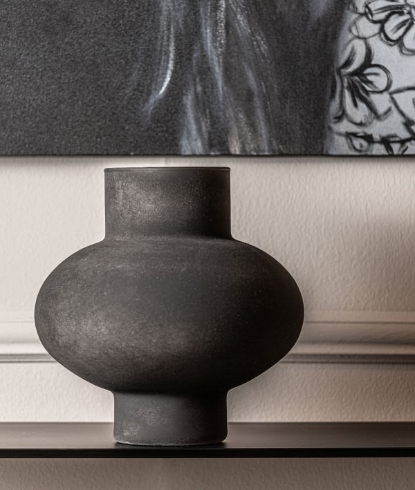 Vaza GHALEA de la KODU este o piesă sculpturală care impresionează prin silueta sa voluminoasă și finisajul elegant din sticlă neagră mată. Cu un design ce combină influențe etnice și estetica modernă, această vază adaugă profunzime și caracter oricărui spațiu interior.