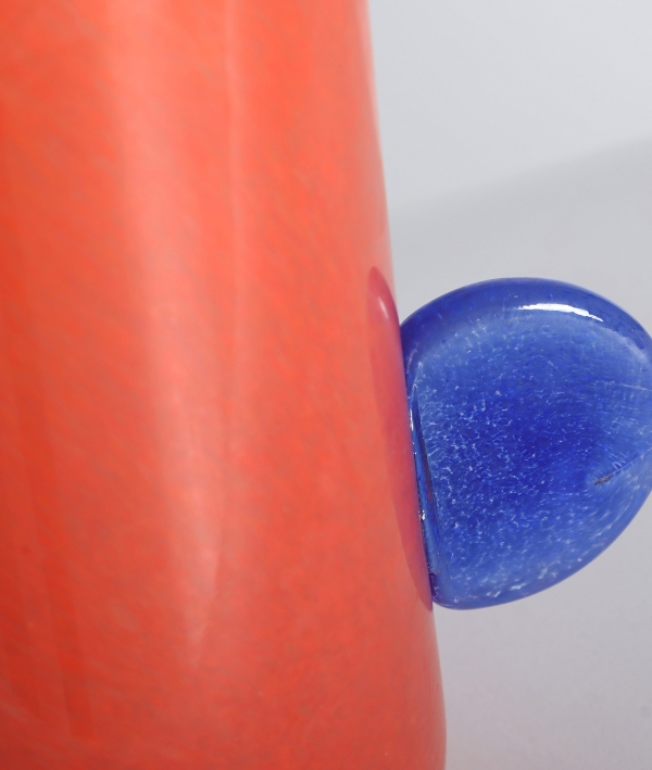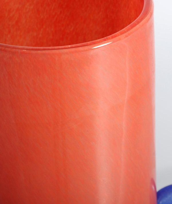 Această vază sticlă portocalie decorativă impresionează prin contrastul cromatic puternic dintre corpul principal și elementele laterale sculpturale, în nuanțe de roșu și albastru. Silueta cilindrică modernă este completată de aceste detalii artistice care dau obiectului o personalitate vivace și neconvențională.