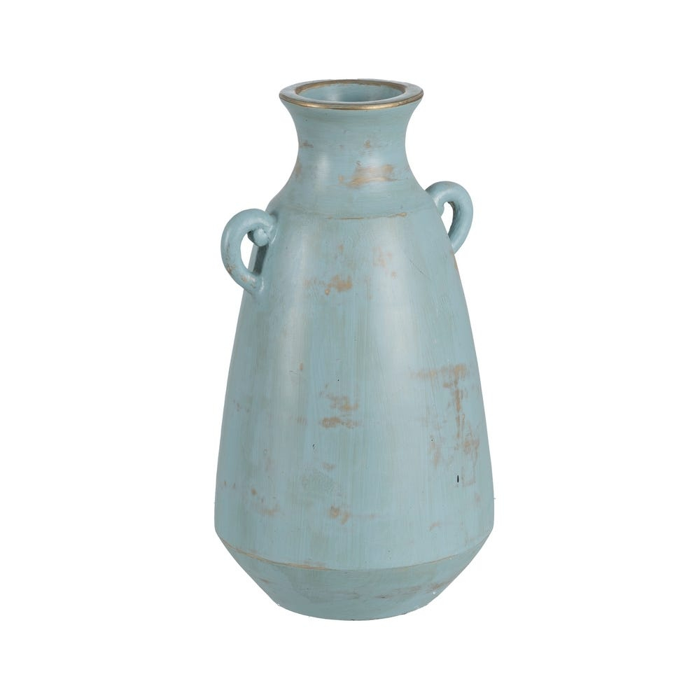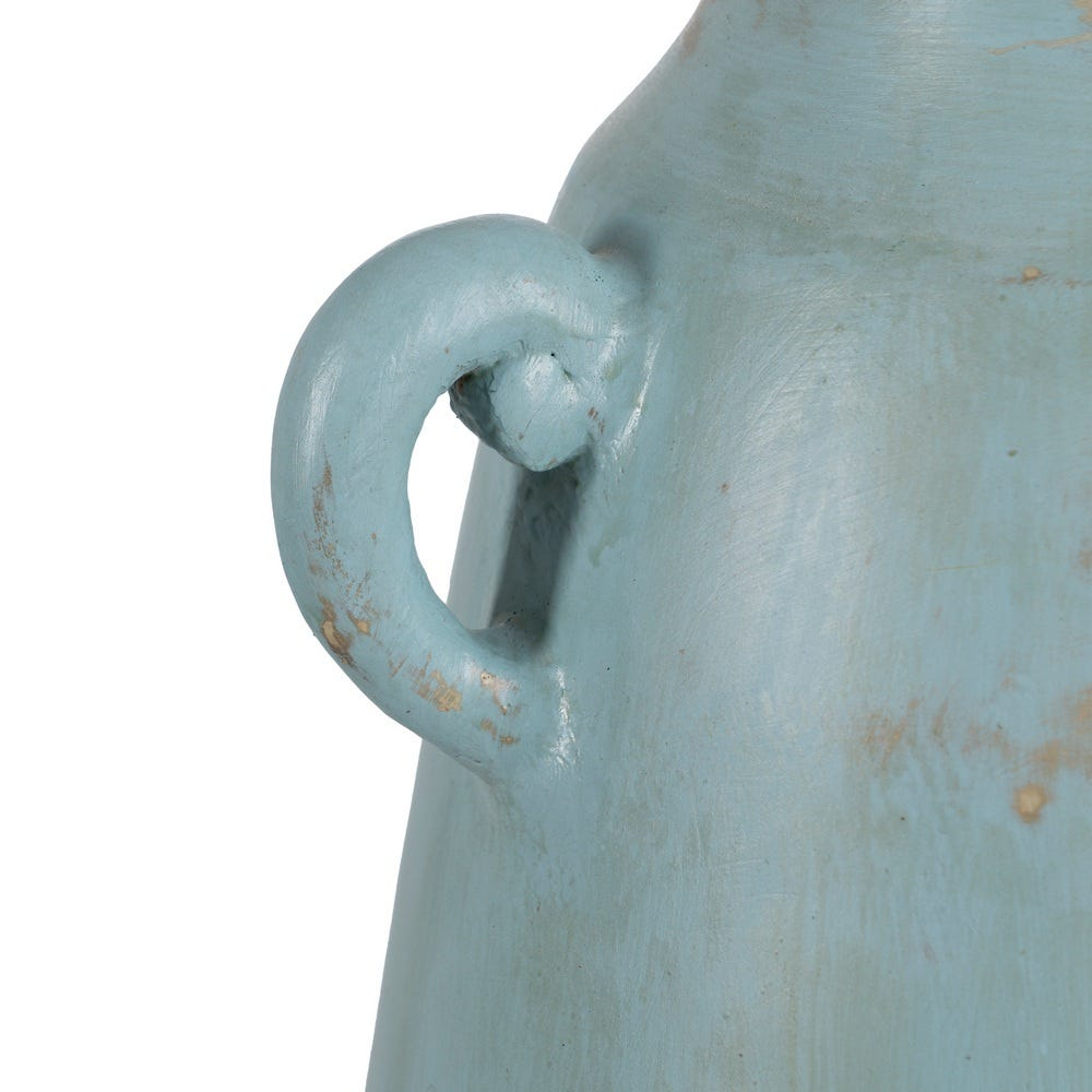 Această vază decorativă din teracotă turcoaz aduce un plus de culoare și autenticitate în orice spațiu și se potrivește ușor în amenajări relaxate și expresive. Forma sa conică este completată de două toarte laterale care oferă un detaliu vizual plăcut și un aer decorativ aparte.