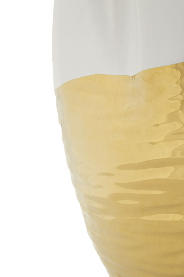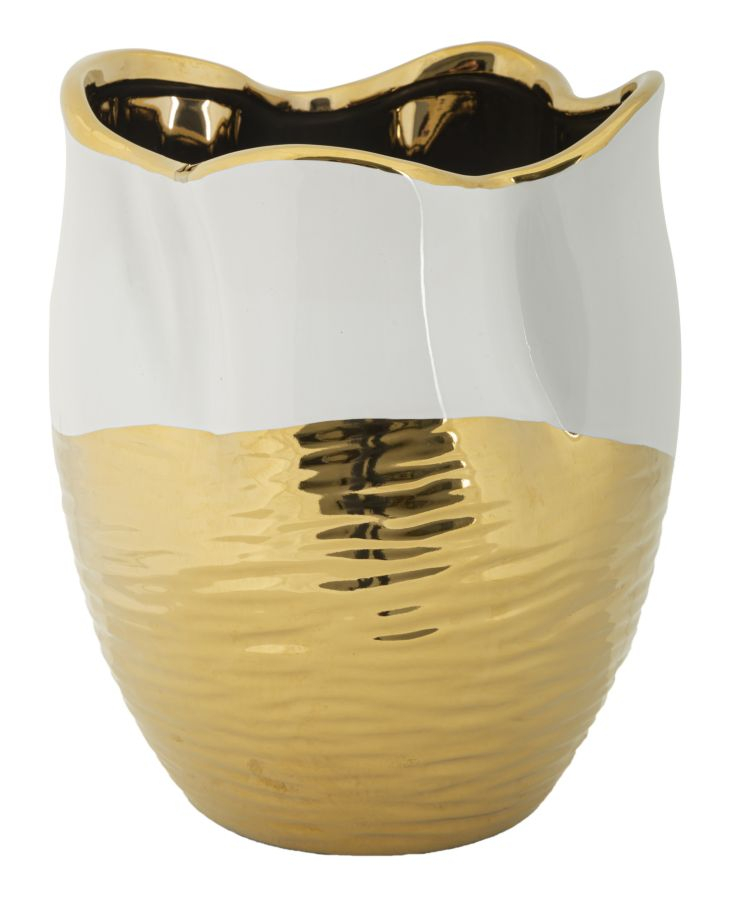 Vază decorativă cu design ondulat și contrast alb-auriu, potrivită pentru decoruri glam. Ideală pentru a aduce un plus de strălucire și eleganță în orice încăpere.