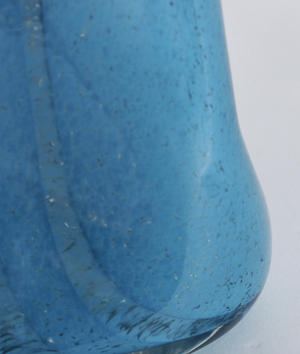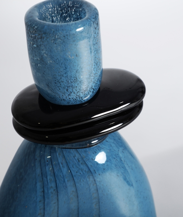 Această vază sticlă albastră decorativă se remarcă prin forma sa sculpturală, ușor asimetrică, ce creează un efect vizual fluid și organic. Nuanța intensă de albastru, completată de accentele negre lucioase din zona gâtului, adaugă profunzime și contrast, transformând piesa într-un obiect de interes estetic.