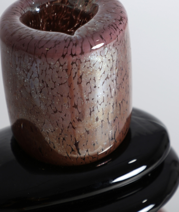 Această vază sticlă burgundy decorativă impresionează prin forma sa sculpturală, organică, evidențiată de volumetria ușor asimetrică ce creează fluiditate și expresivitate. Tonul intens de burgundy, satinat și punctat discret, este completat de inelul negru lucios din zona gâtului, un detaliu care conferă contrast și accent grafic obiectului.
