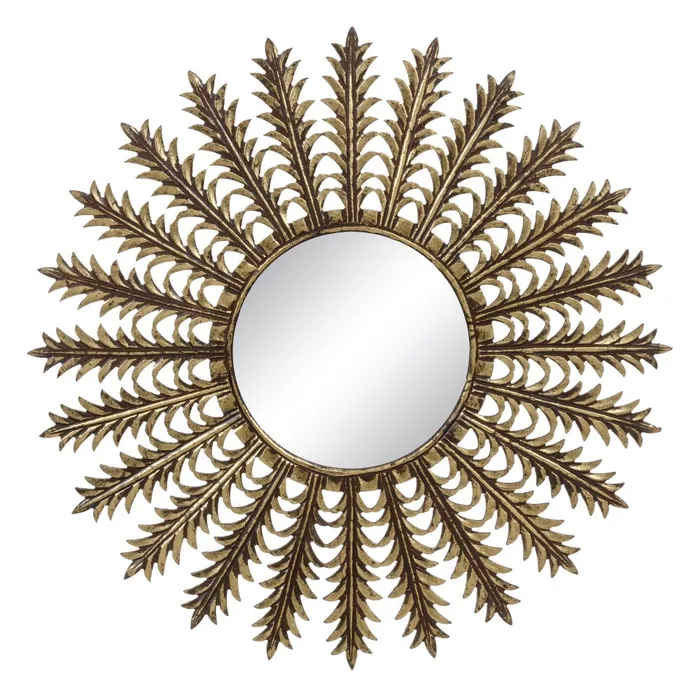 Această oglindă decorativă aurie MDF iese în evidență prin designul său sculptat cu meticulozitate, inspirat de formele naturale ale frunzelor stilizate. Fiecare detaliu al cadrului este lucrat cu grijă, creând o structură simetrică ce aduce un efect vizual remarcabil. Diametrul exterior de 90 cm și cel interior de 33 cm oferă un echilibru perfect între suprafața oglinzii și sculptura bogată din jur, iar grosimea de 1,75 cm îi conferă o prezență robustă. Designul său sculptat manual oferă un aspect unic, ideal pentru interioare de lux, transformând orice spațiu într-un punct focal de eleganță. CreativDeco îți oferă și alte oglinzi sculptate pentru a-ți completa decorul cu stil.