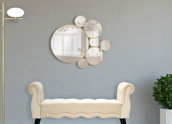 Oglinda decorativa spectaculoasa cu rama metalica aurie.