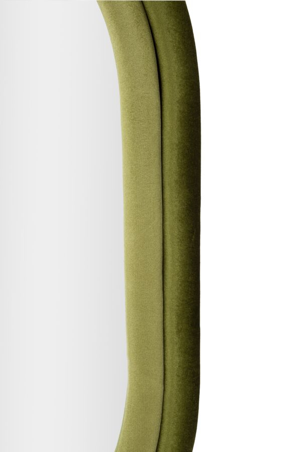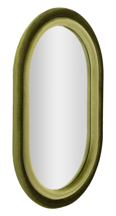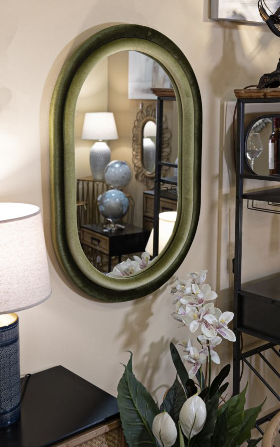 Oglinda ovala cu rama din catifea verde, obiect decorativ rafinat pentru living, dormitor sau dressing. Design italian Mauro Ferretti pentru interioare elegante.