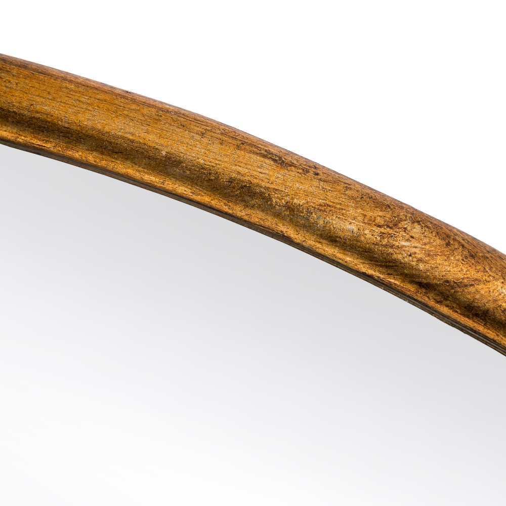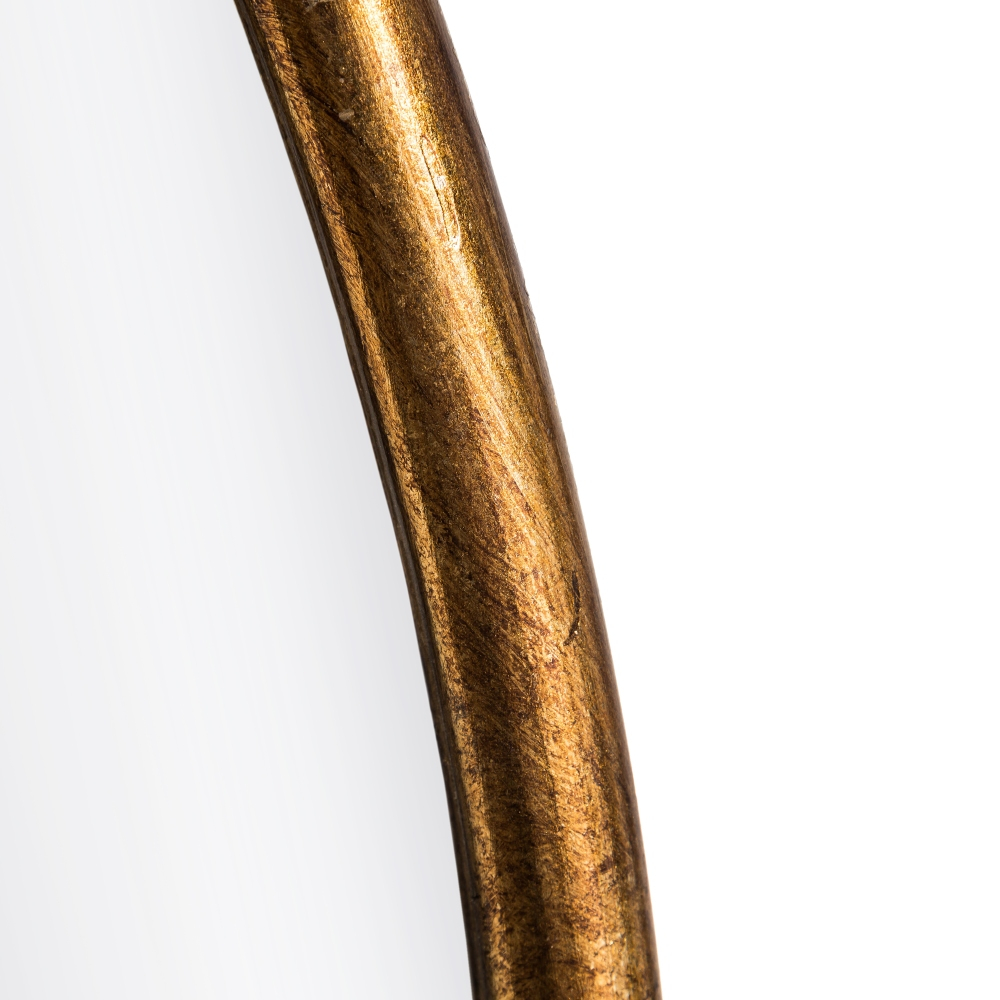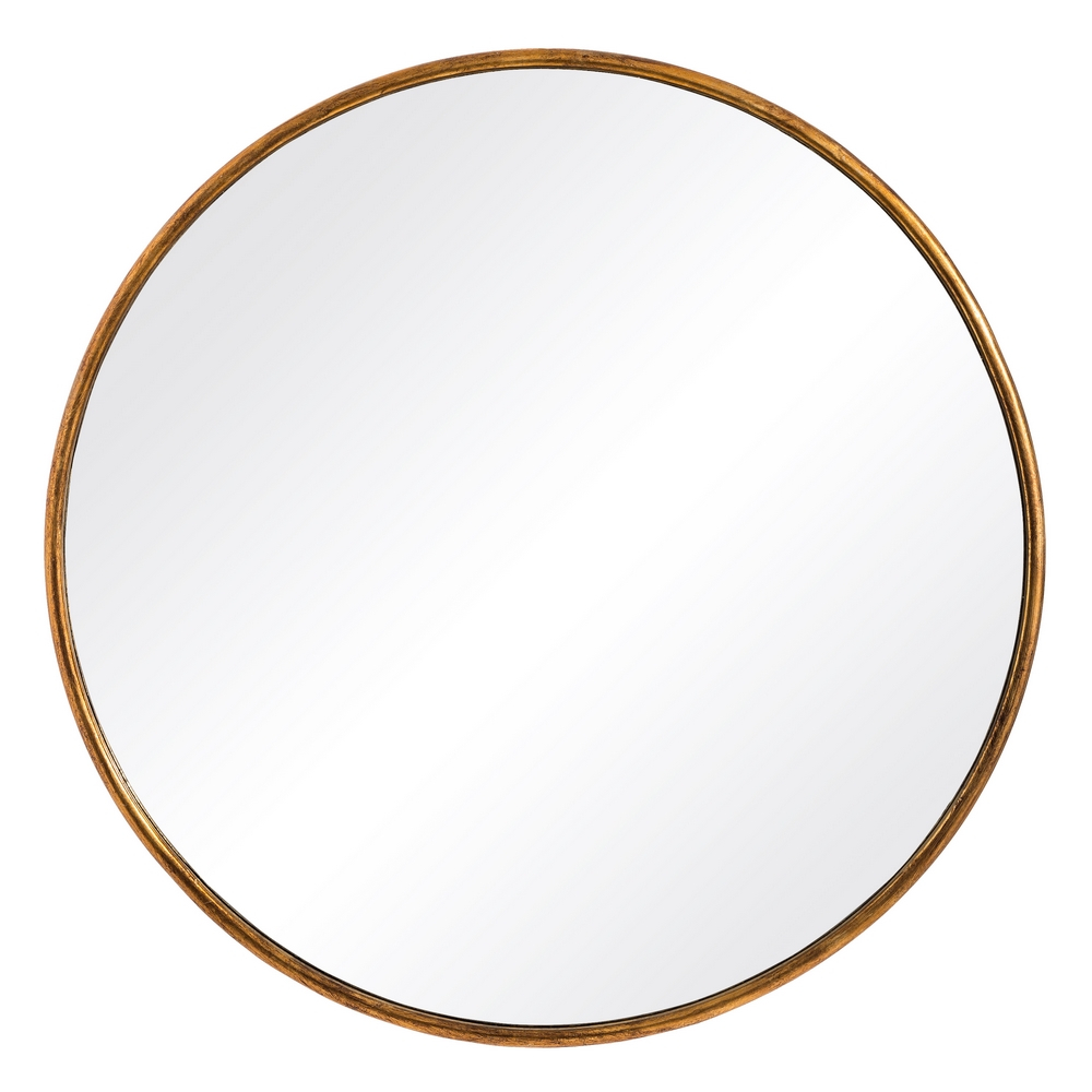 Oglindă decorativă rotundă, cu ramă din metal de culoare aurie, ideală pentru a aduce luminozitate și spațiu în living, dormitor sau hol.